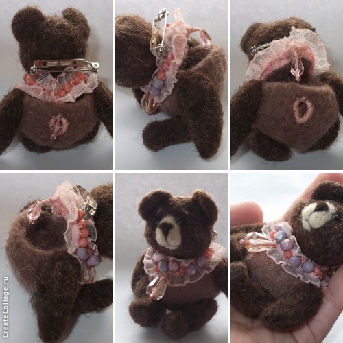 Далее украшаем по своему желанию мишку. По кругу вокруг шеи делаем воротничок, украшаем красивыми разностями (у меня стеклянные бусины). На крышечке брошки (где воротничок) сзади головы пришиваем бусину или красивую пуговку нужного размера. На тельце (под воротничком после разреза) делаем отверстие или петельку для пуговки, чтобы наша брошка закрывалась. Пришиваем основу для брошки к голове.