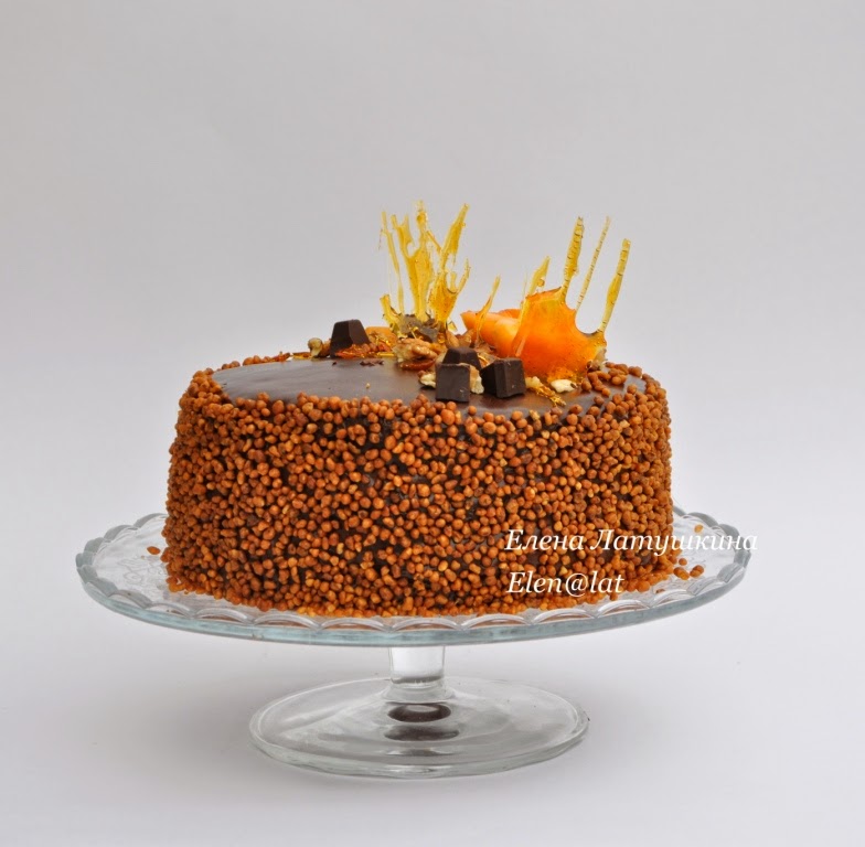 Охлажденный торт достать из морозильной камеры и облить глазурью. Далее украсить по желанию. У меня абрикос, грецкие орехи в карамели, кусочки темного шоколада, грецкие орехи и карамель.