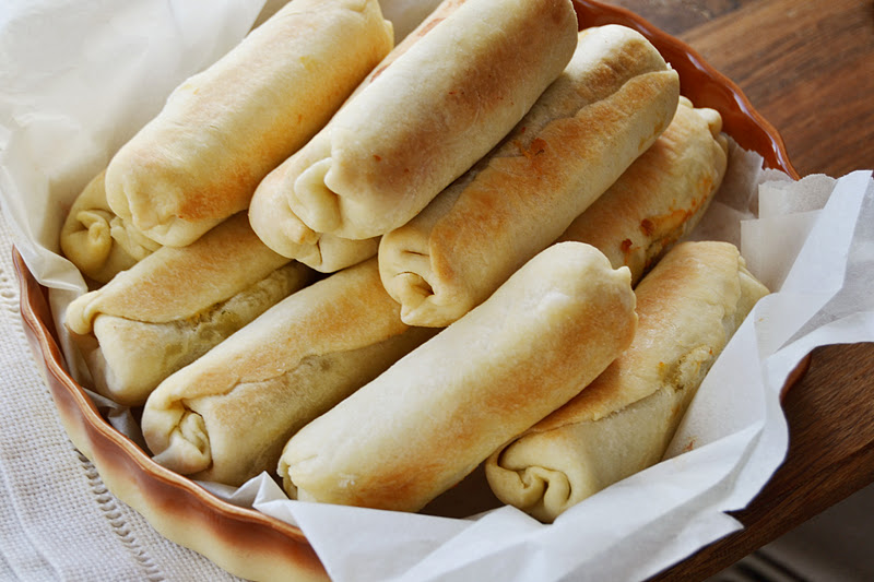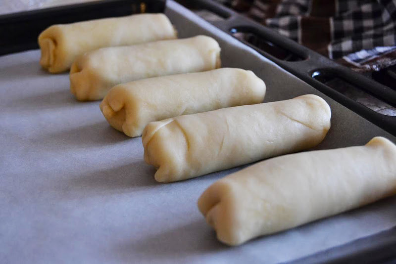 Края подвернуть. Скатать трубочкой и заправить края (как на голубцы); выложить на противень (швом вниз), застеленный пергаментом.