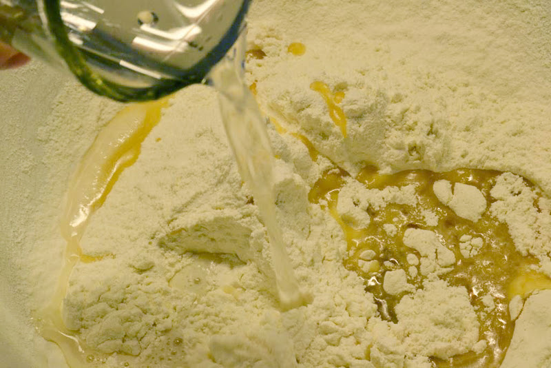 1. Муку просеять в миску, добавить масло и воду. Замесить гладкое