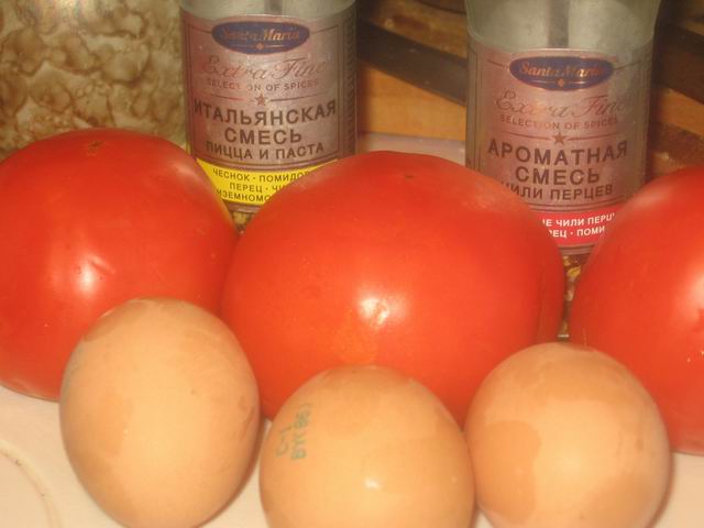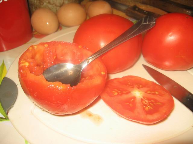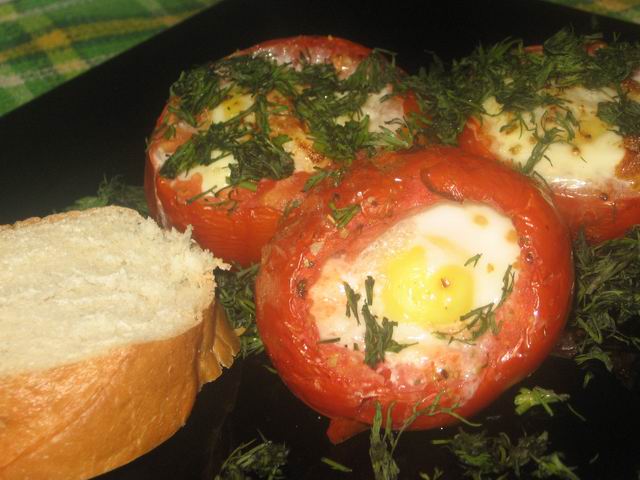 В каждую помидорку влить яйцо. Посолить, поперчить.