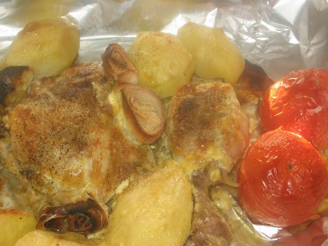 Очень просто. Нужно иметь один - два окорочка, несколько картофелин, 1-2 луковицы, пару помидор, 1 столовую ложку майонеза, соль, специи. Вкуснота необыкновенная и никаких усилий!