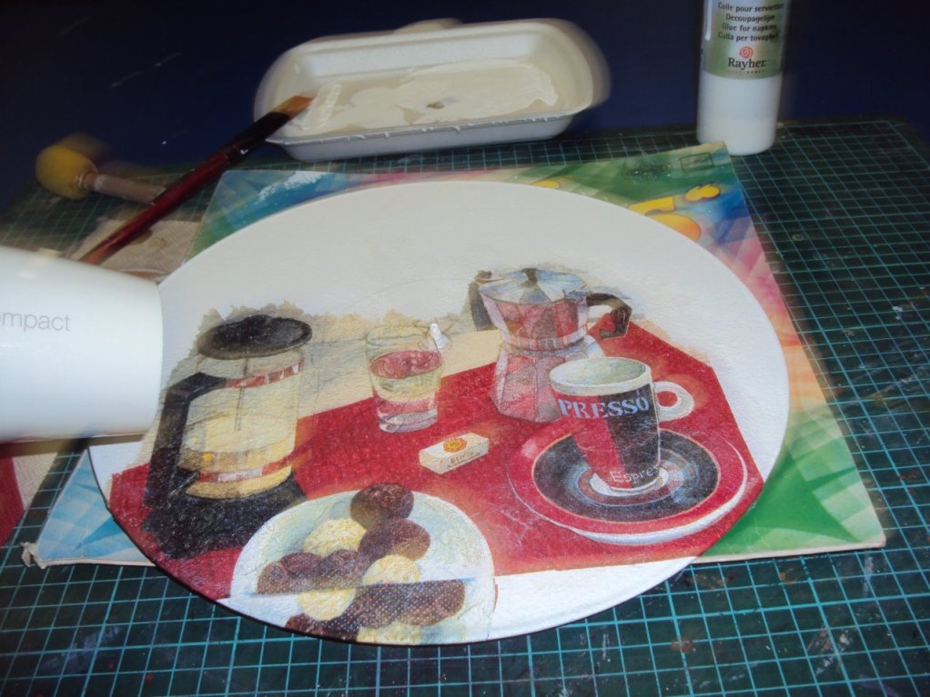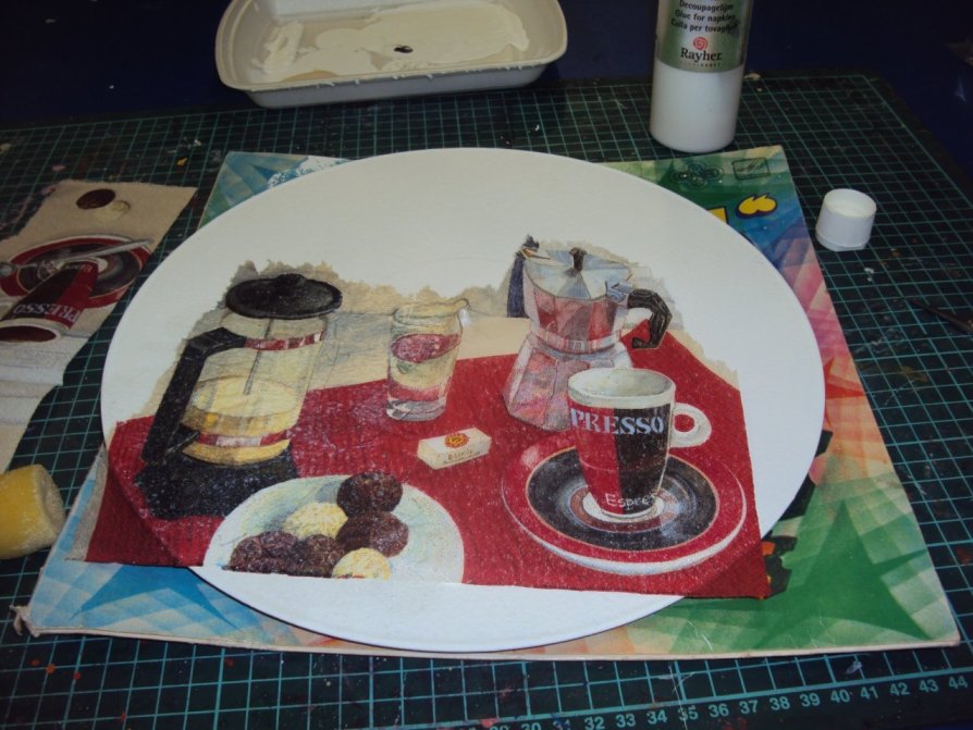 Если рисунок "внезапно" обрывается, можно надставить его фрагментом из другой такой же салфетки, что я и сделала)). Сушим.