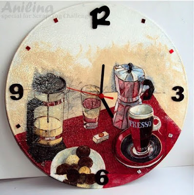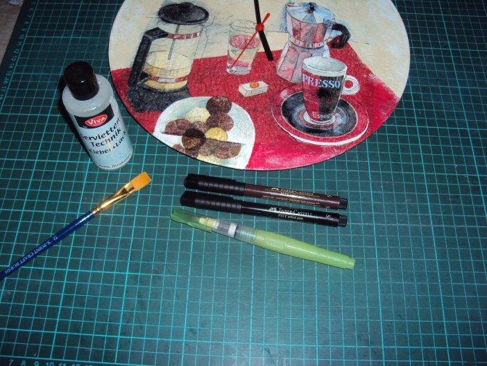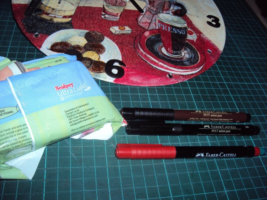 Мне захотелось украсить часы каким-то объёмным элементом. Но ничего подходящего не нашлось, и я сделала украшение из пластики - чашку кофе.