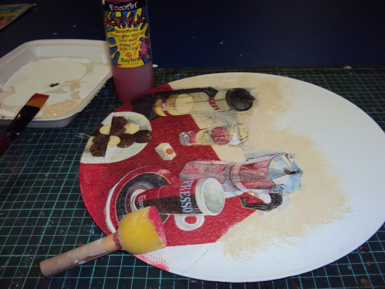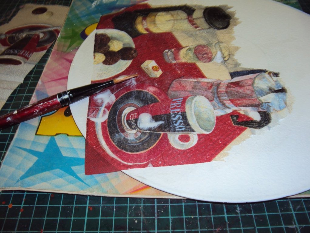 Аккуратно наносим специальный "салфеточный" клей (можно заменить разведённым 1:3 клеем ПВА) кисточкой поверх салфетки, разравнивая, тем самым приклеиваем салфетку к поверхности .