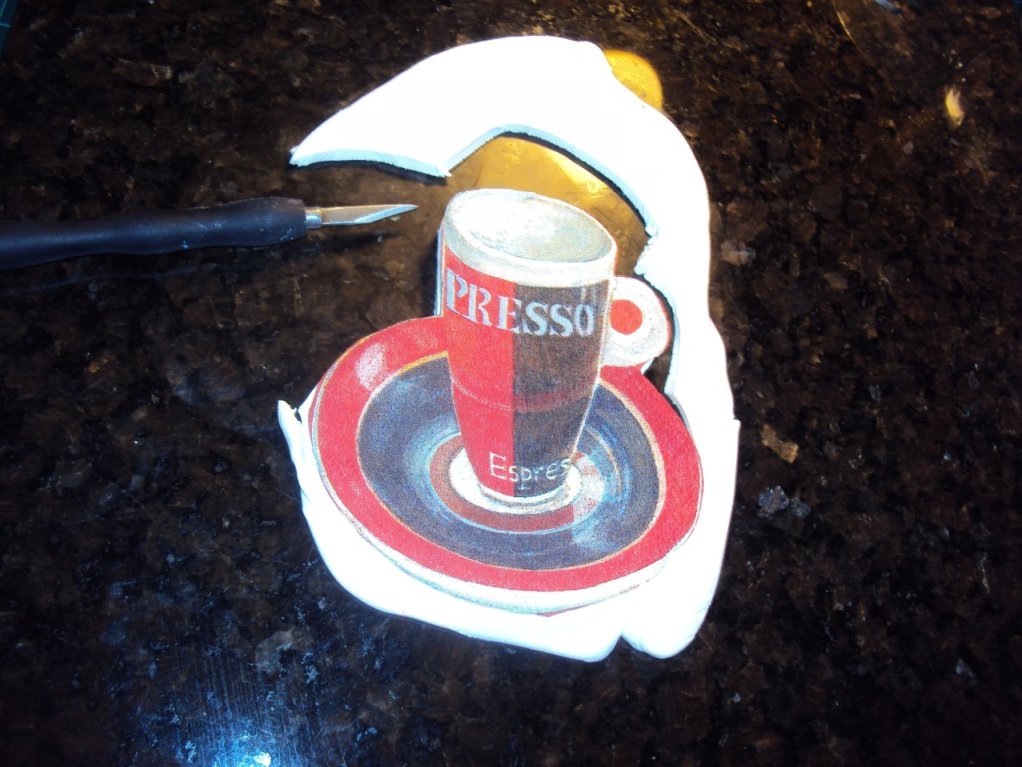 Раскатываем тонким пластом полимерную глину (в моём случае Sculpey Ultra Light), приклеиваем на наш пласт выбранную картинку и вырезаем необходимый для объёма мотив по контуру рисунка. Запекаем в духовке при температуре 130 градусов по Цельсию). Можно также вырезать мотив из самозатвердевающей массы для моделирования, также категории "облегчённая". Мне нравится больше полимерная глина, так как она ровнее раскатывается.