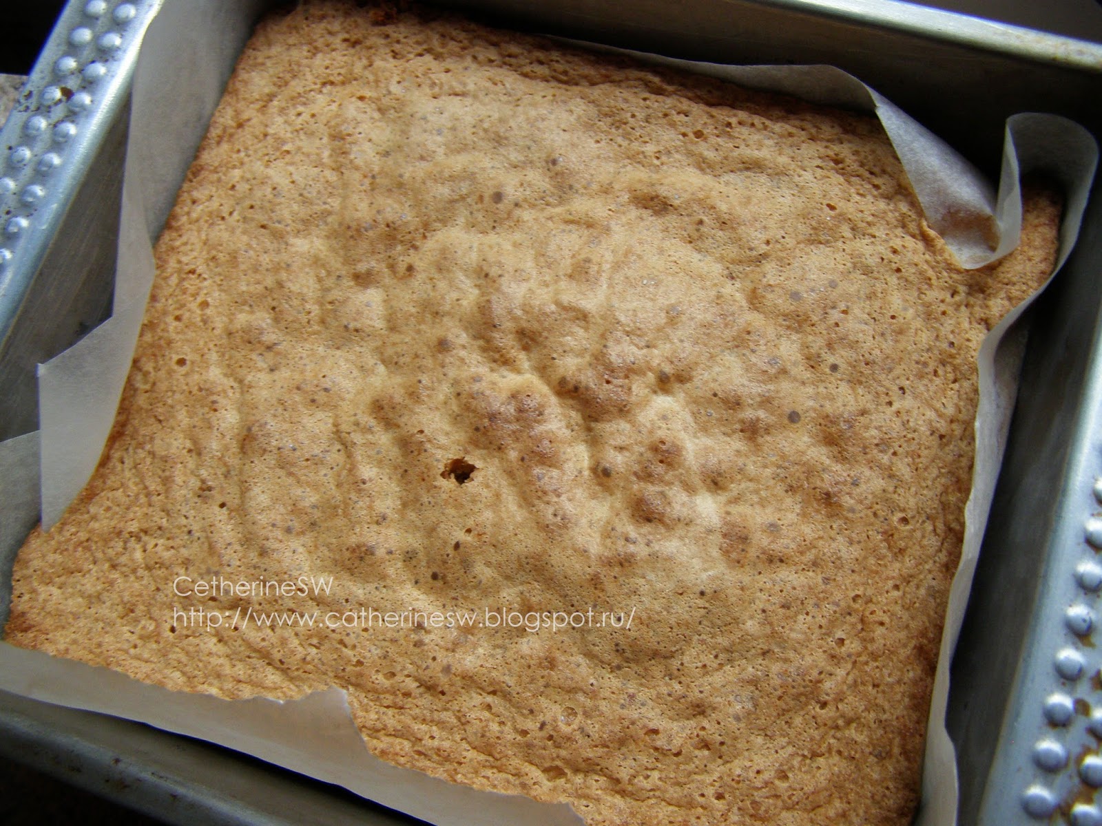 6. Форму выстелить пергаментом. Вылить тесто. Поставить на средний уровень духовки и выпекать 30-40 минут. Готовность проверим с помощью лучины. Проткнем бисквит и вытащим. Сухая - готово.