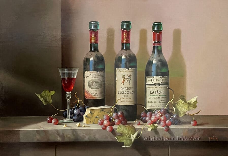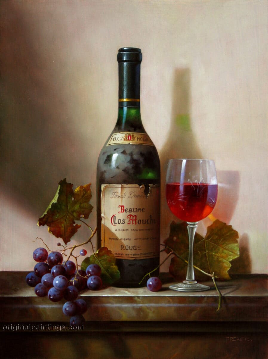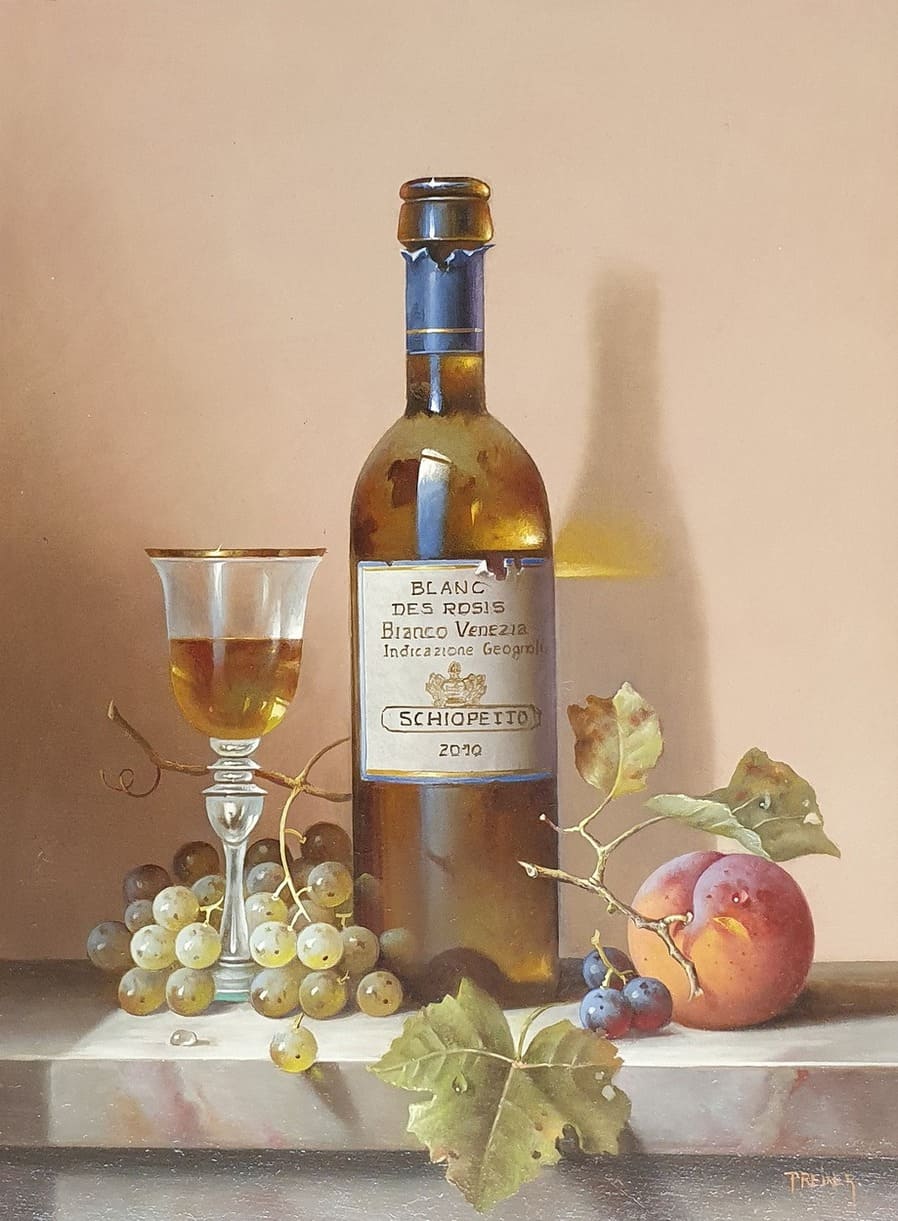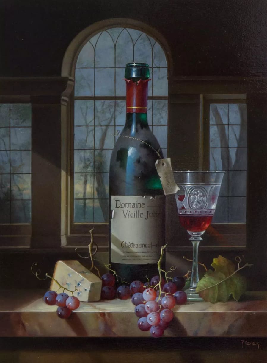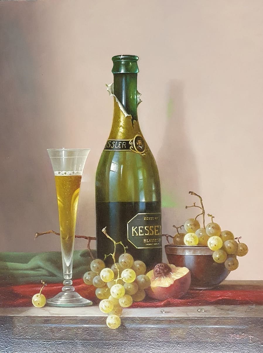 Его подход к композиции и цвету остается верным традиции, с тонкими тонами, изысканно прерываемыми глубокими бордовыми оттенками красного вина или сверкающим изумрудным блеском бутылки. Художник работает с традиционной масляной краской, что позволяет ему добиться своего роскошного стиля, который прекрасно сочетается с изысканными винами, которые он изображает.