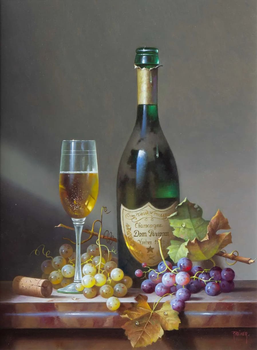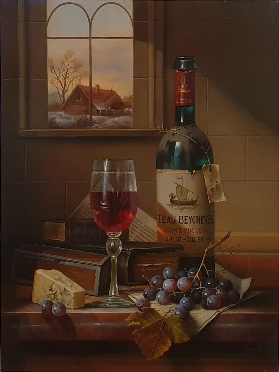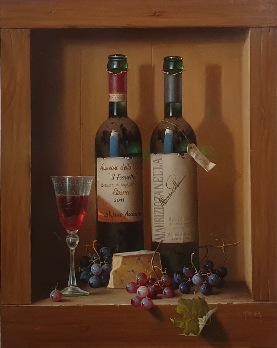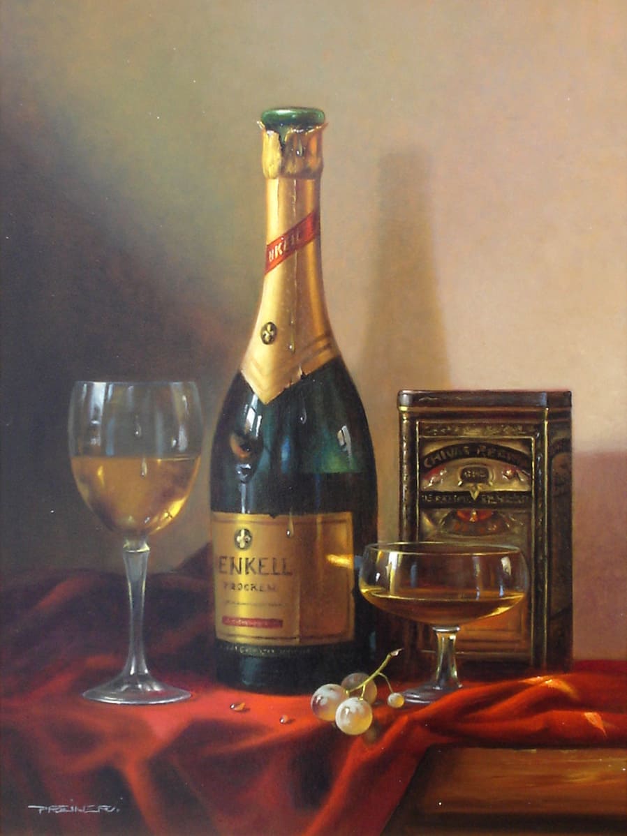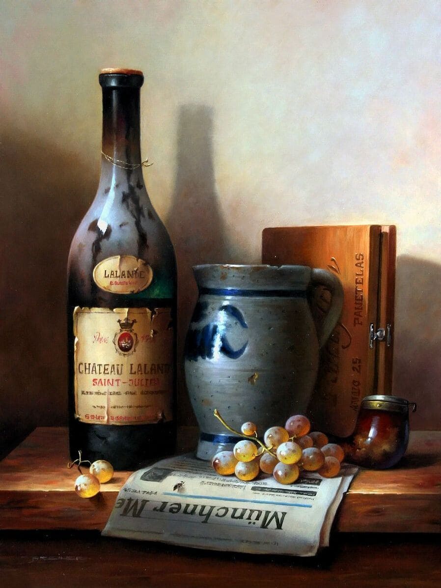 Его подход к композиции и цвету остается верным традиции, с тонкими тонами, изысканно прерываемыми глубокими бордовыми оттенками красного вина или сверкающим изумрудным блеском бутылки. Художник работает с традиционной масляной краской, что позволяет ему добиться своего роскошного стиля, который прекрасно сочетается с изысканными винами, которые он изображает.