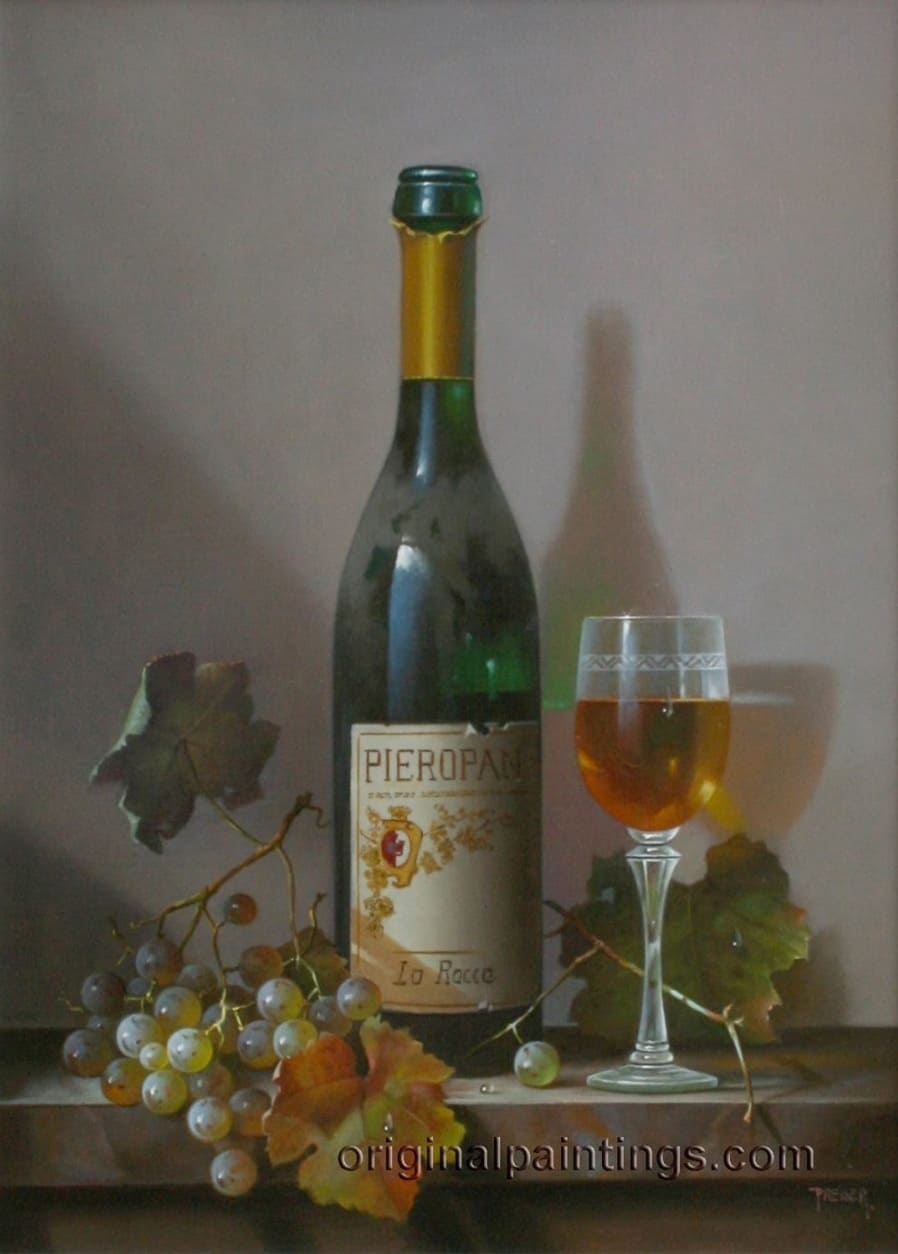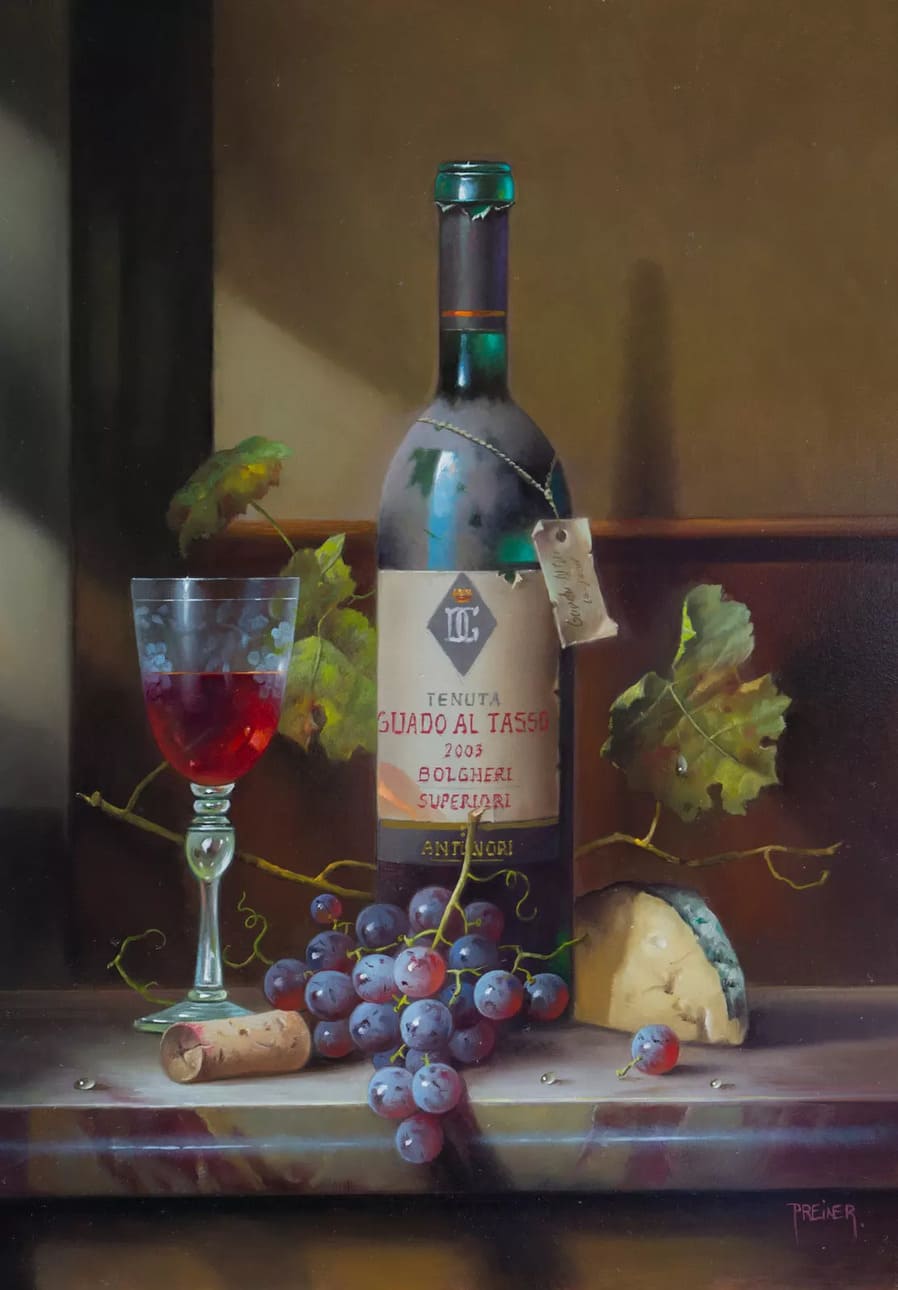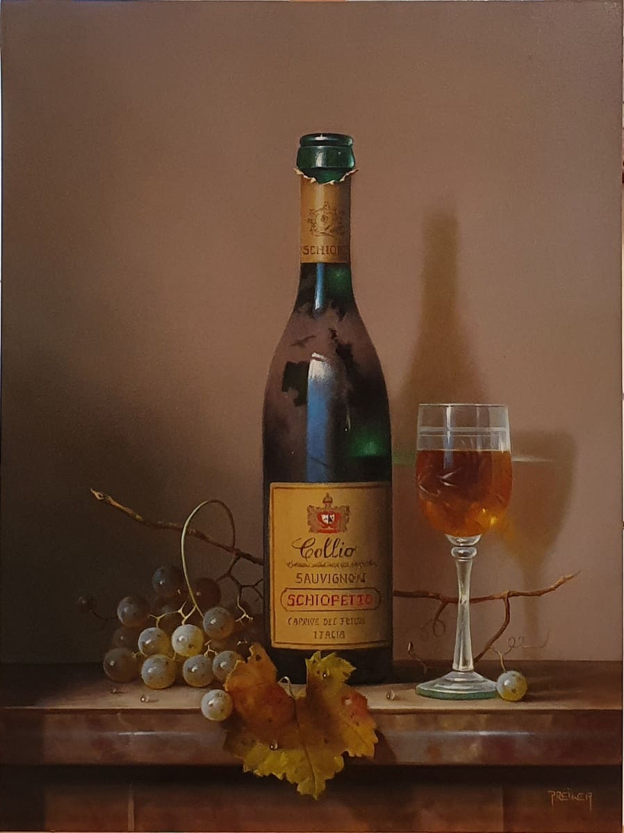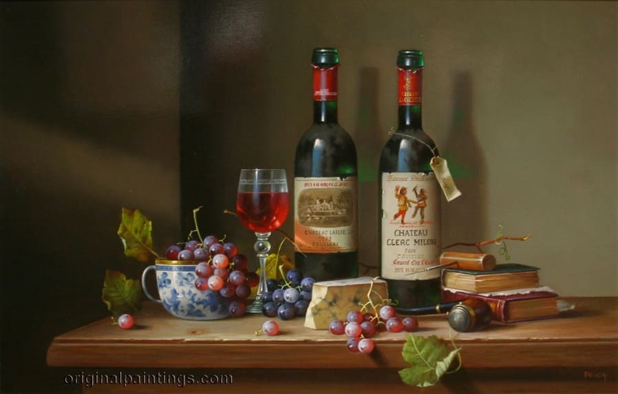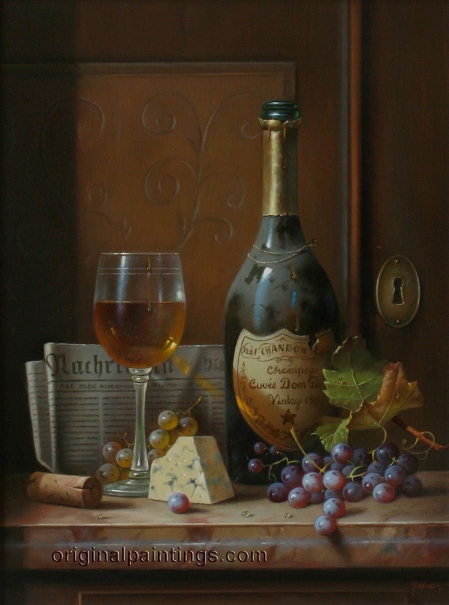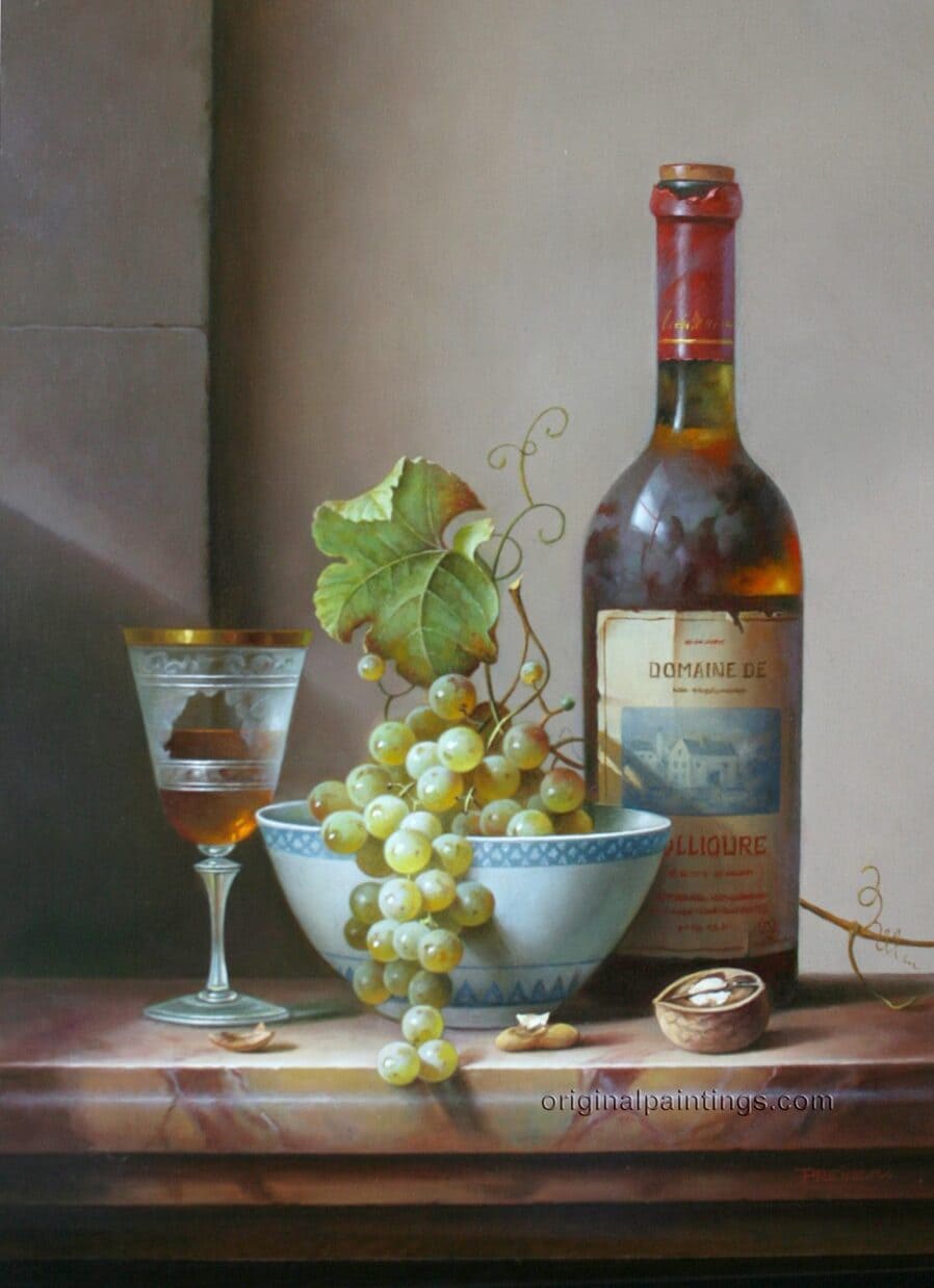 Его подход к композиции и цвету остается верным традиции, с тонкими тонами, изысканно прерываемыми глубокими бордовыми оттенками красного вина или сверкающим изумрудным блеском бутылки. Художник работает с традиционной масляной краской, что позволяет ему добиться своего роскошного стиля, который прекрасно сочетается с изысканными винами, которые он изображает.