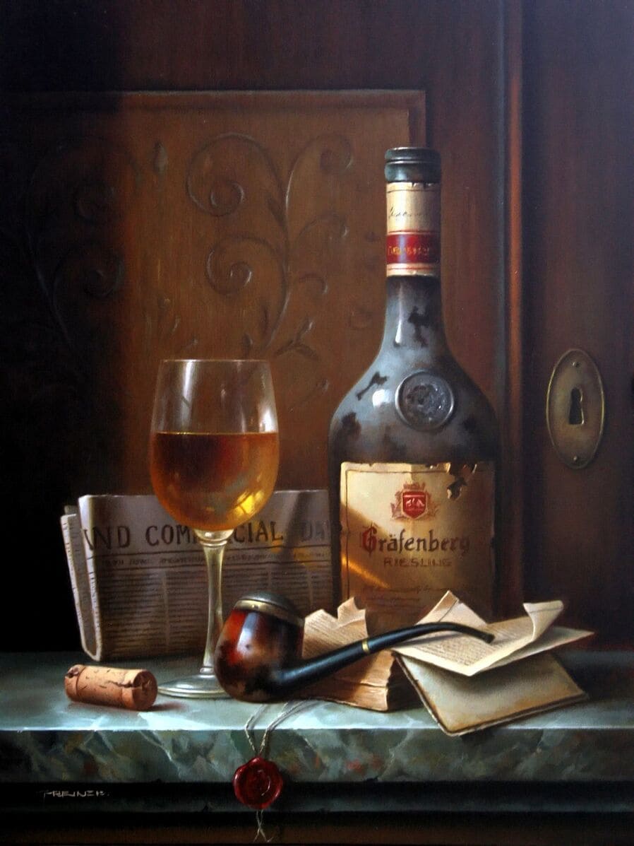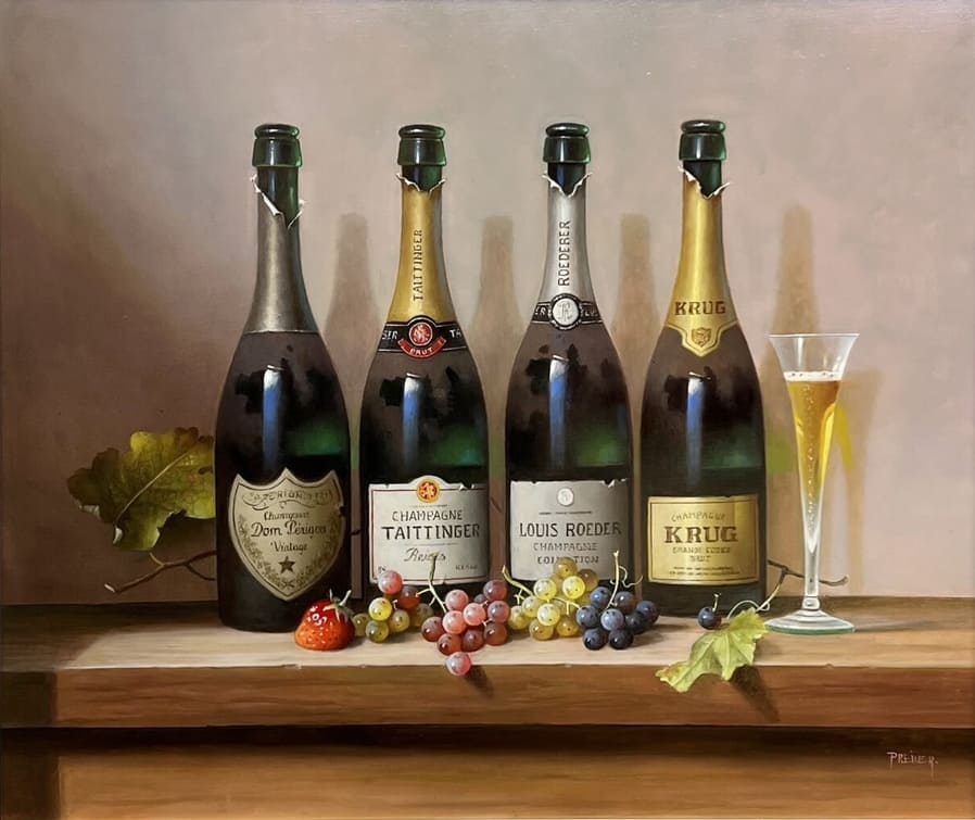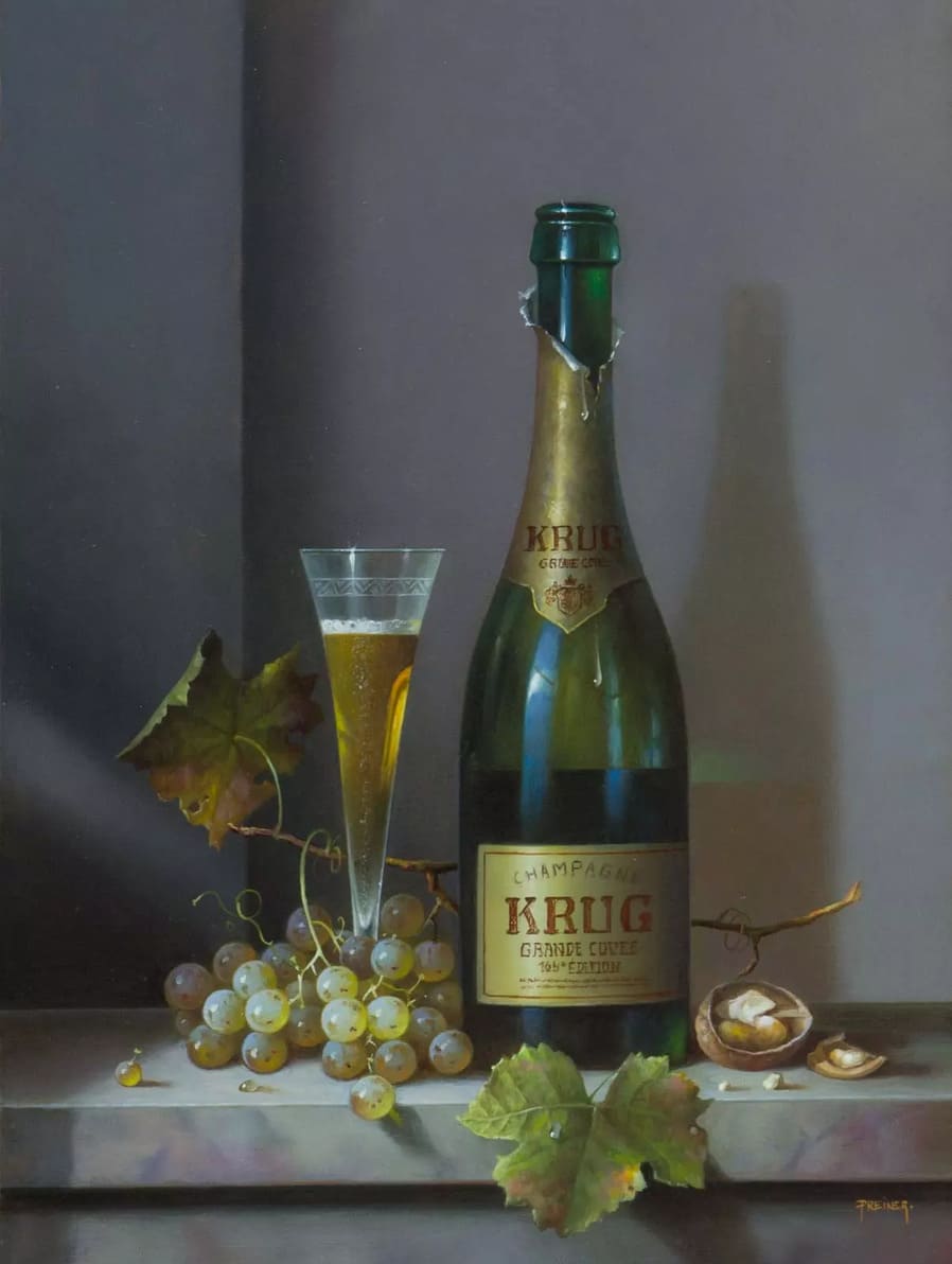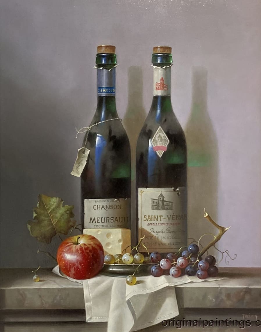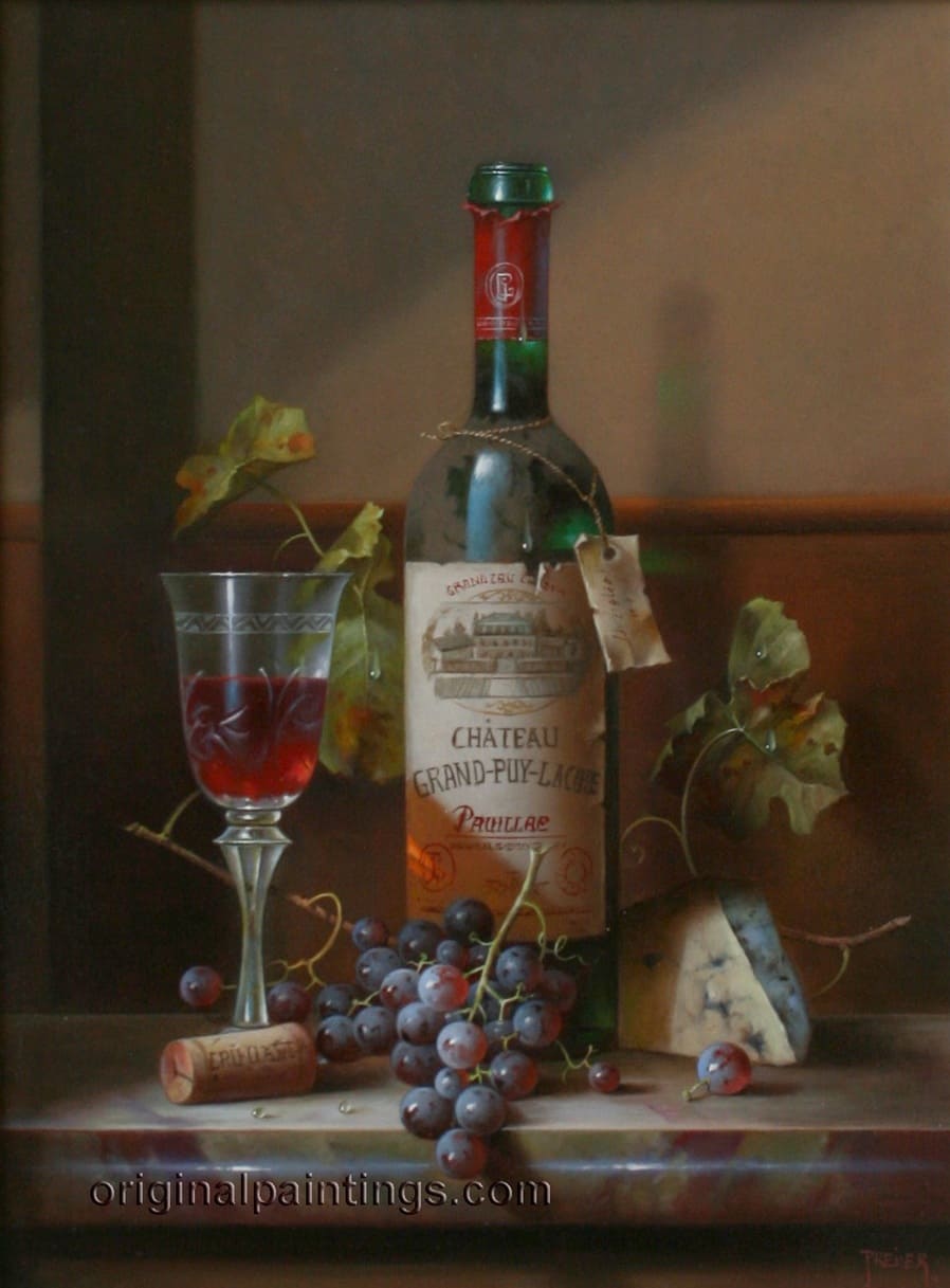 Его подход к композиции и цвету остается верным традиции, с тонкими тонами, изысканно прерываемыми глубокими бордовыми оттенками красного вина или сверкающим изумрудным блеском бутылки. Художник работает с традиционной масляной краской, что позволяет ему добиться своего роскошного стиля, который прекрасно сочетается с изысканными винами, которые он изображает.