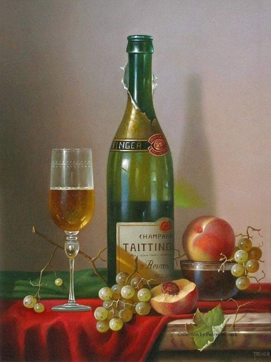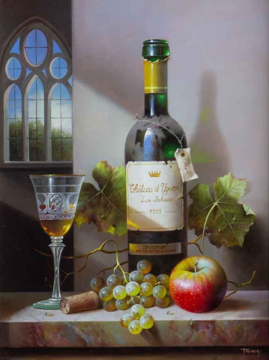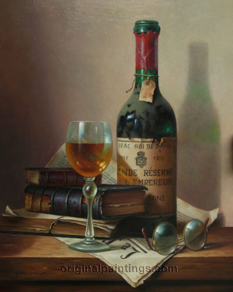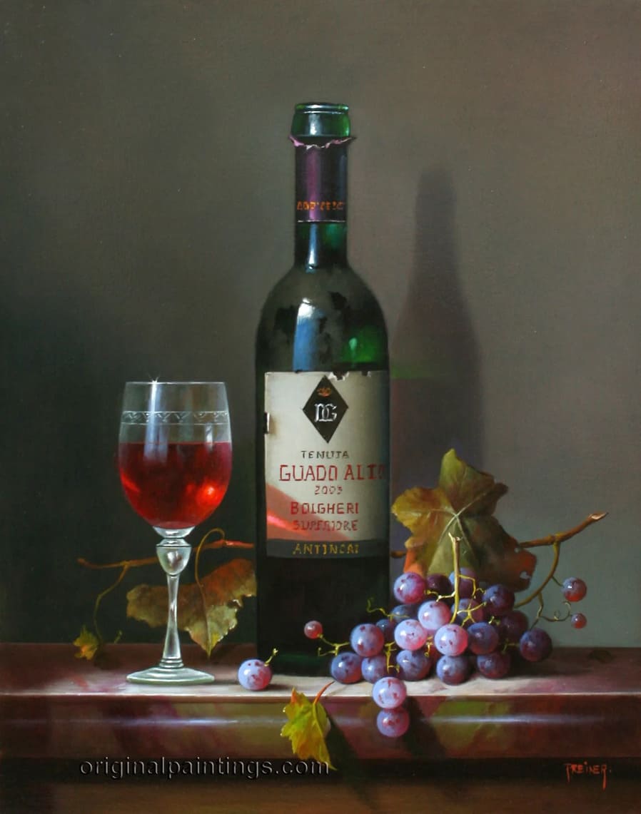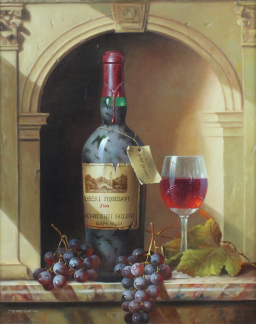Его подход к композиции и цвету остается верным традиции, с тонкими тонами, изысканно прерываемыми глубокими бордовыми оттенками красного вина или сверкающим изумрудным блеском бутылки. Художник работает с традиционной масляной краской, что позволяет ему добиться своего роскошного стиля, который прекрасно сочетается с изысканными винами, которые он изображает.