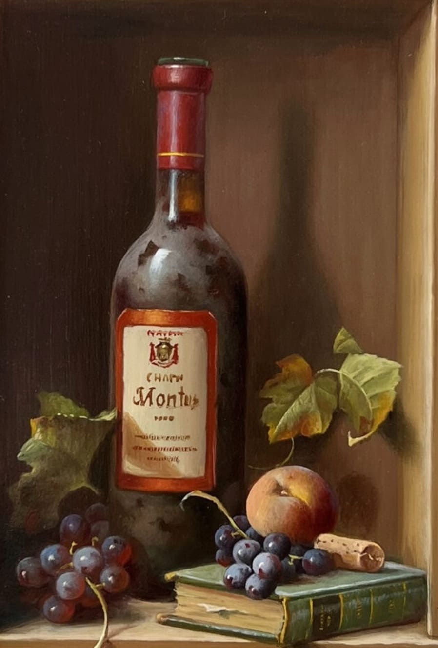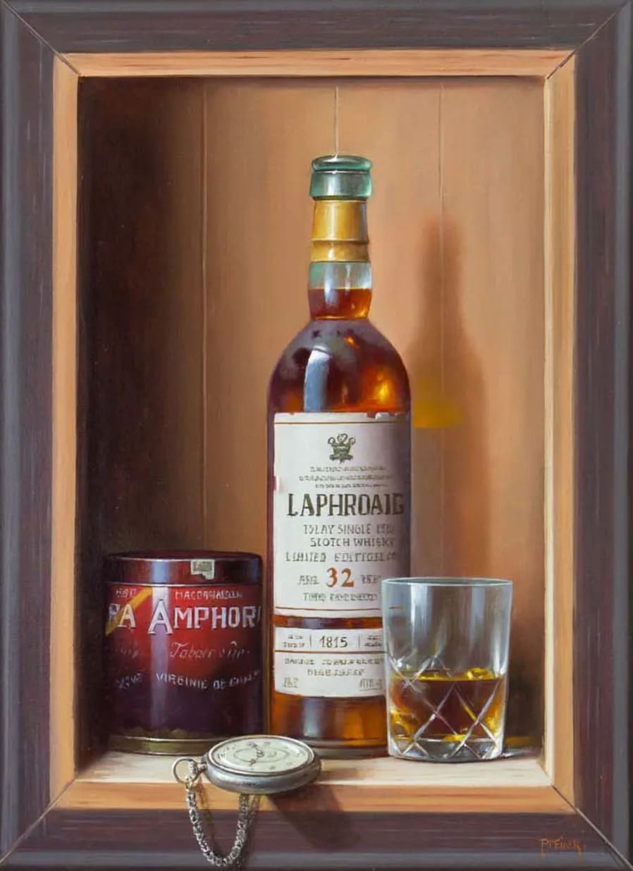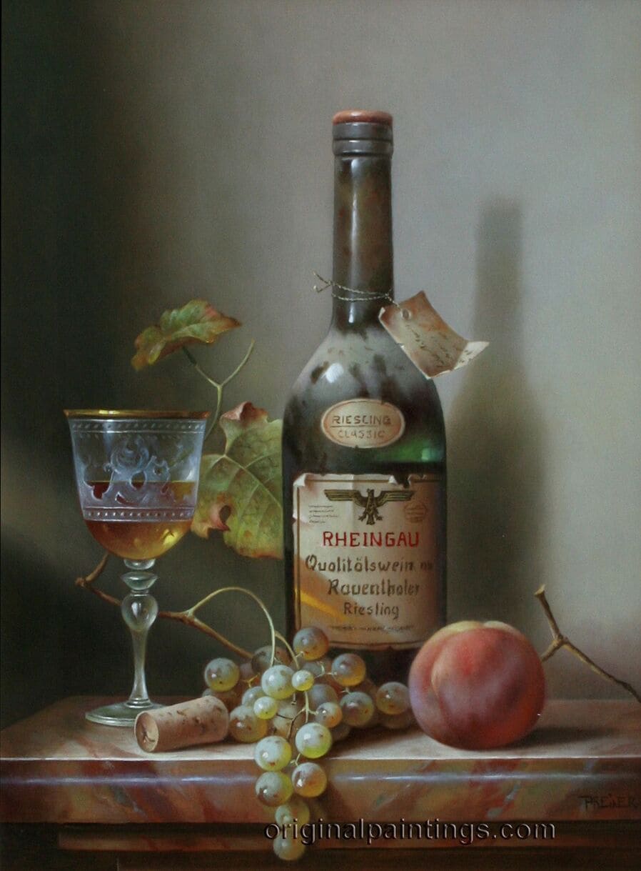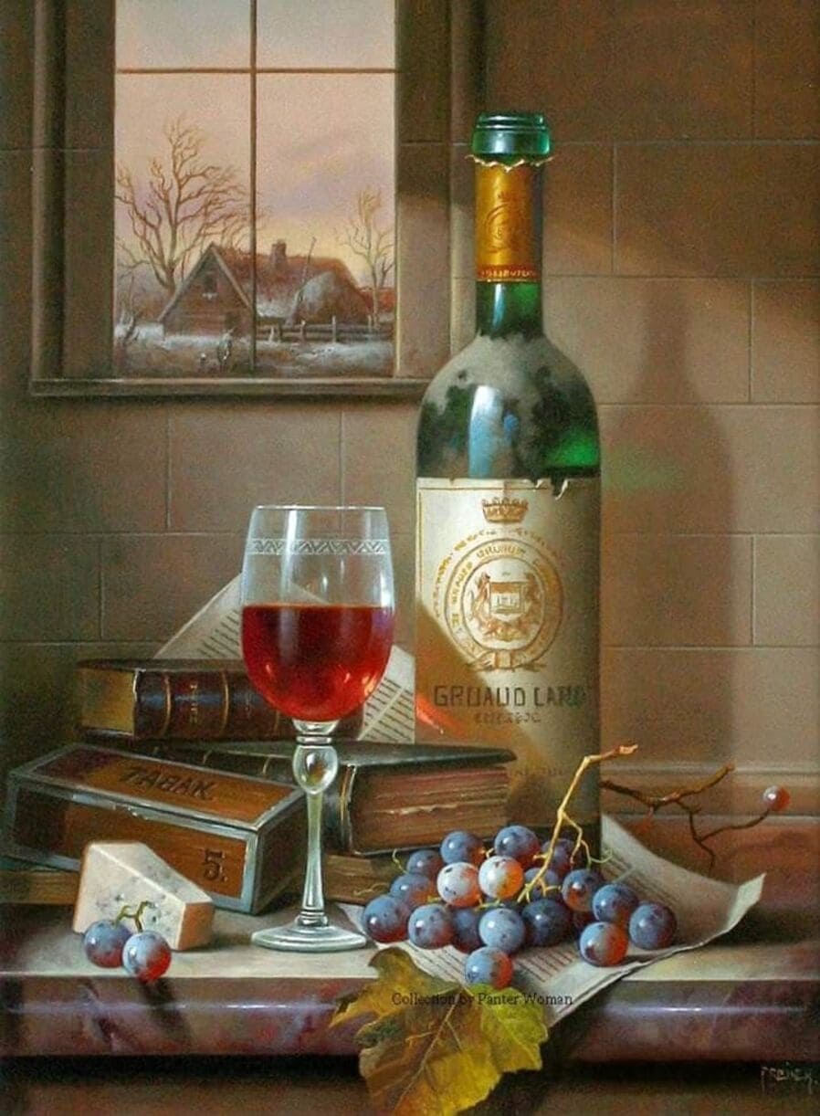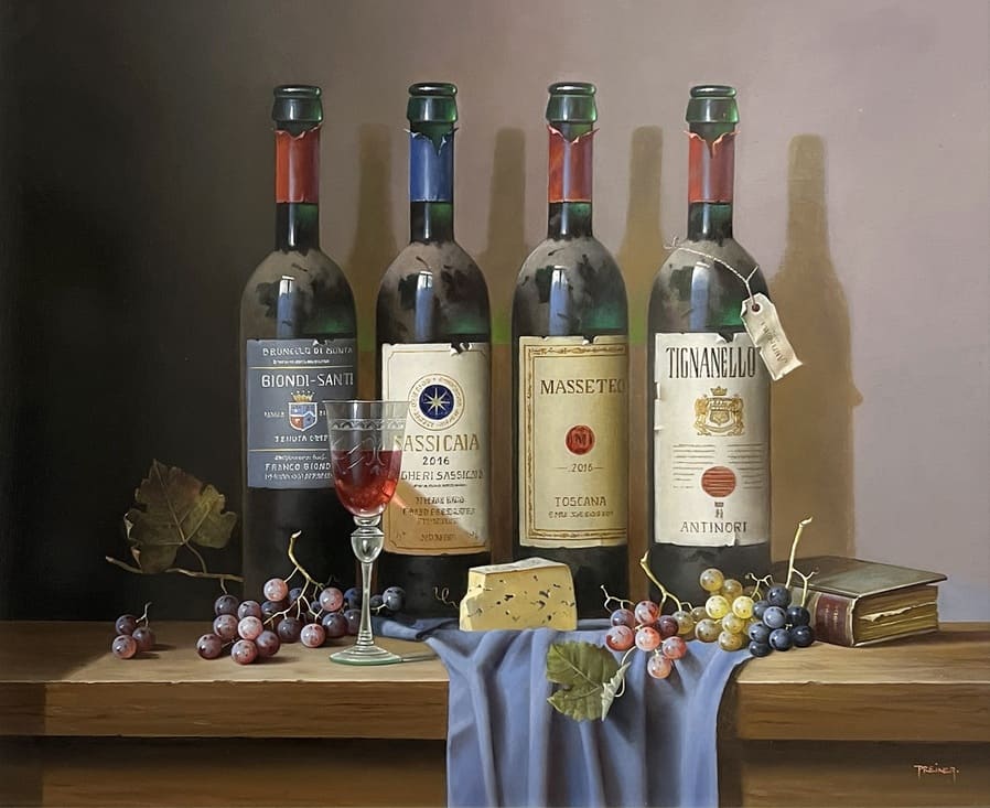 Его подход к композиции и цвету остается верным традиции, с тонкими тонами, изысканно прерываемыми глубокими бордовыми оттенками красного вина или сверкающим изумрудным блеском бутылки. Художник работает с традиционной масляной краской, что позволяет ему добиться своего роскошного стиля, который прекрасно сочетается с изысканными винами, которые он изображает.