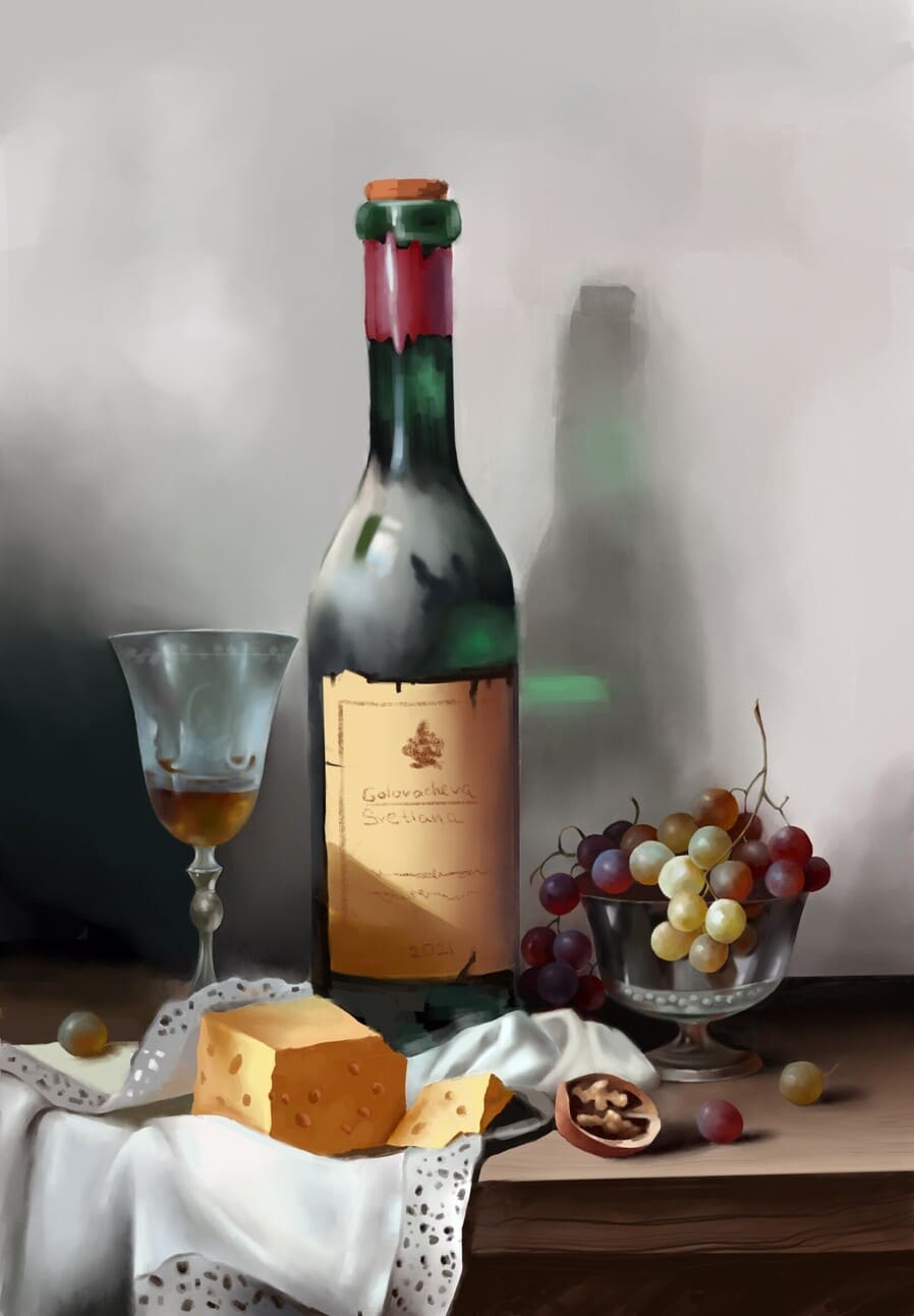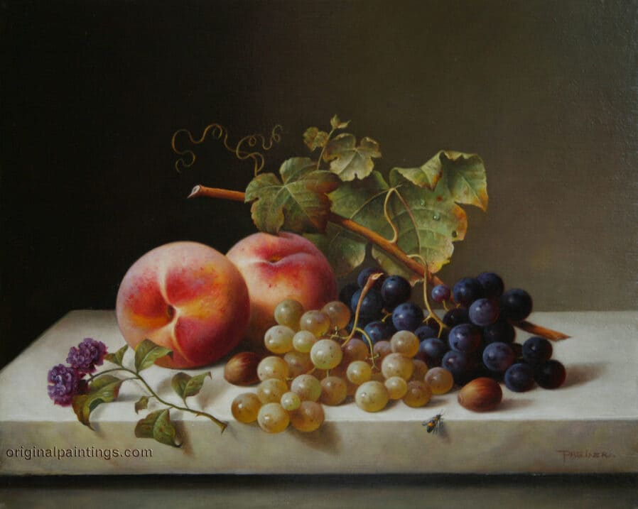 Его учителя поощряли его развивать этот выдающийся талант, и он начал вырабатывать свой собственный стиль, создавая великолепные натюрморты.Он разработал технику живописи с детальной проработкой и убедительной передачей натуры, изображая объекты необычайно точно. Его работы отличаются высокой детализацией и невероятной световой силой. На этой скромной панели художник достигает необычайного уровня детализации – от блеска света на бокале вина до завитка виноградного листа.Художник создает ощущение роскоши как благодаря богатству сюжета, так и благодаря тщательному исполнению сцены. Изящной рукой Золтан мастерски добивается эффекта trompe-l'ōil, создавая иллюзию пространства и глубины в своих натюрмортах.