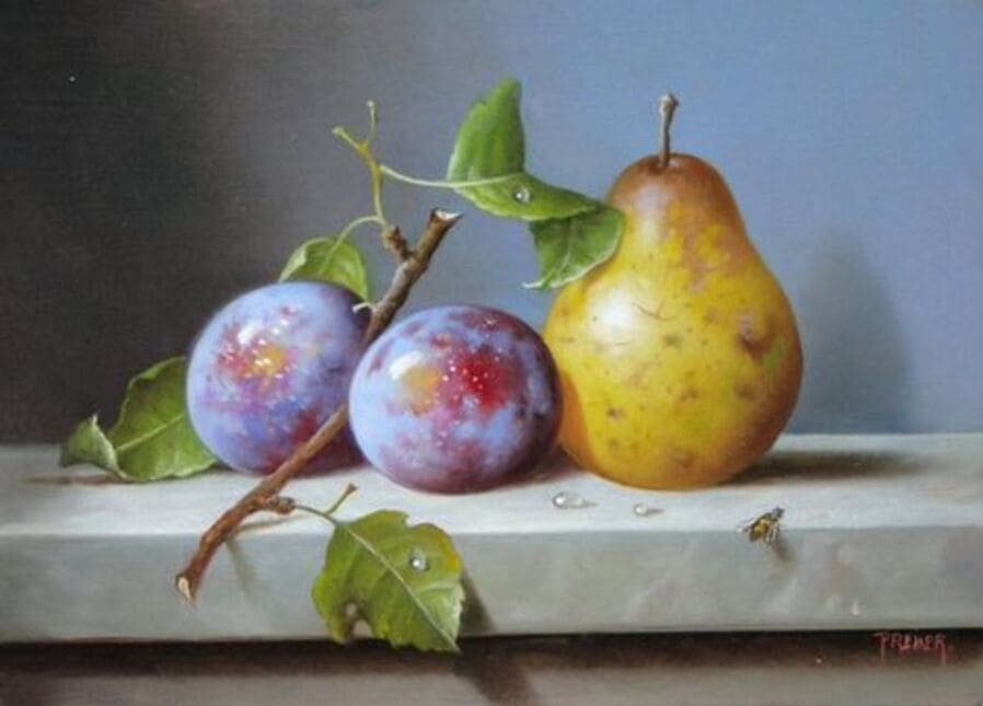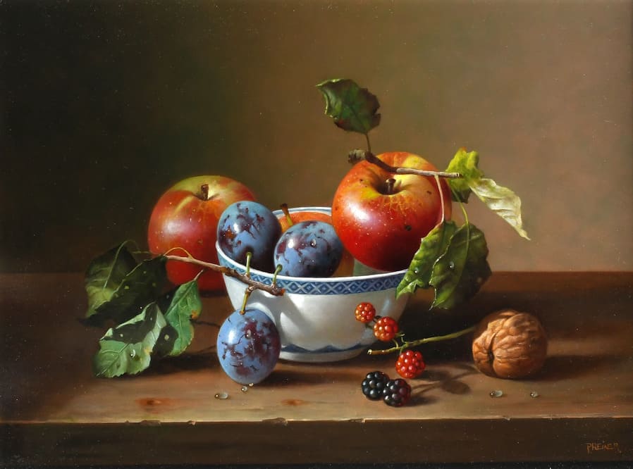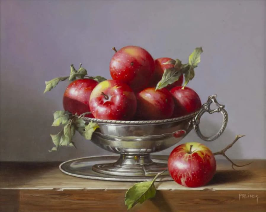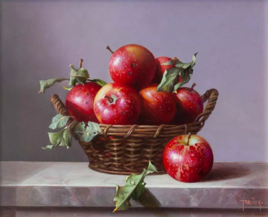 Его реалистичные картины маслом написаны с точностью, которая приглашает глаз внимательнее рассмотреть богатство деталей.