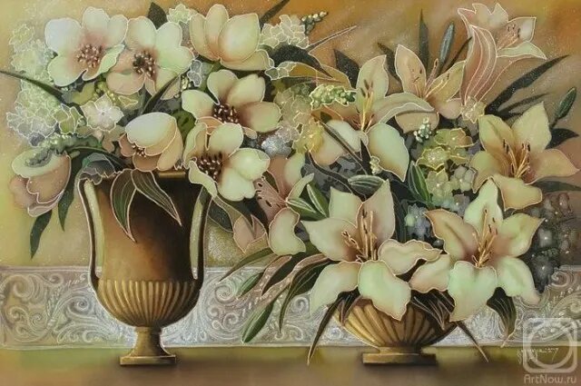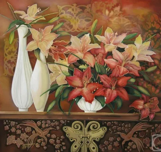 Среди ее излюбленных направлений — живопись, графика, лаковая миниатюра и, конечно, волшебный батик, в котором она сумела создать неповторимый авторский стиль. Чтобы окунуться в этот чарующий мир, стоит внимательно рассмотреть каждое произведение — его тонкую красоту и внутреннюю глубину...