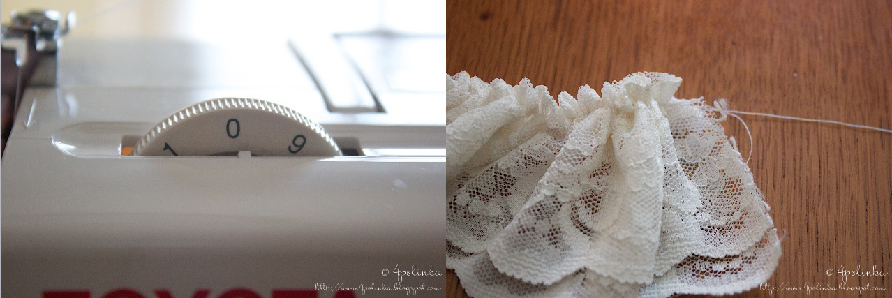 У меня было очень широкое кружево (где-то 15см), я его сложила пополам со смещением и присборив пришила к верху. Сборить самое простое - на машинке. Ставим натяжение на 0, длина стежка на максимум и строчим. Потом вытягиваем одну нитку - сборка готова (не забудьте закрепить концы).