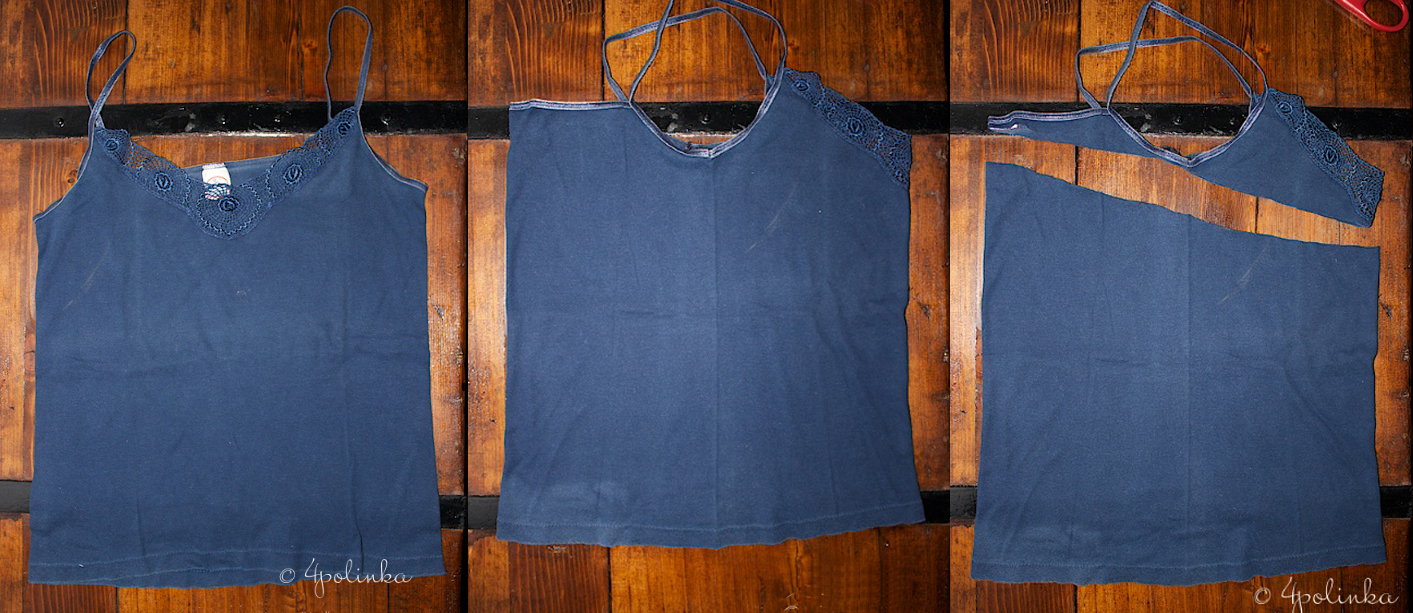 Во-первых, нам надо избавиться от этих безобразных лямок и кружева. Получится перевертыш - перед будет спинкой, спинка - передом.