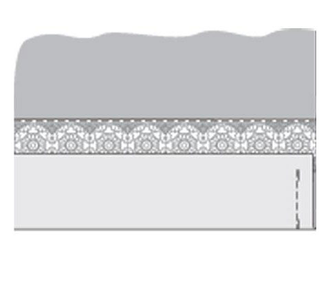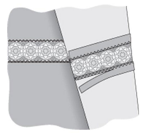 Если продольные края кружевной прошвы не заработаны кромкой, а вдоль них имеются припуски из ткани, то просто заутюжьте эти припуски на изнаночную сторону и притачайте кружевную прошву так, как описано ниже. Затем срежьте припуски кружева вместе с припусками швов притачивания.