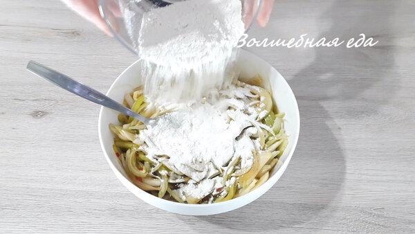 В чашу вбиваю яйца и добавляю к ним соевый соус. При помощи венчика взбиваю. Полученную массу добавляю к овощам и хорошо перемешиваю.