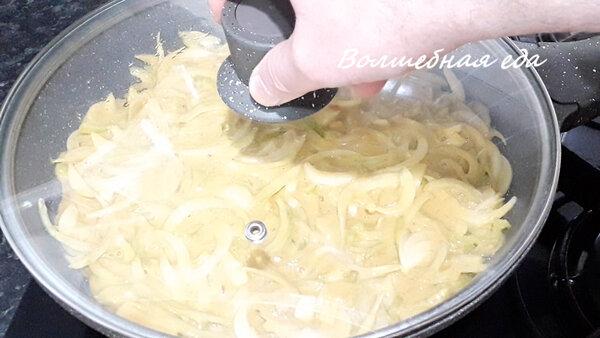 Нарезаю лук на четвертинки и отправляю в кипяток на 2 минутки. Потом охлаждаю его в холодной воде. Сливаю воду и нарезаю тонкими слайсами.