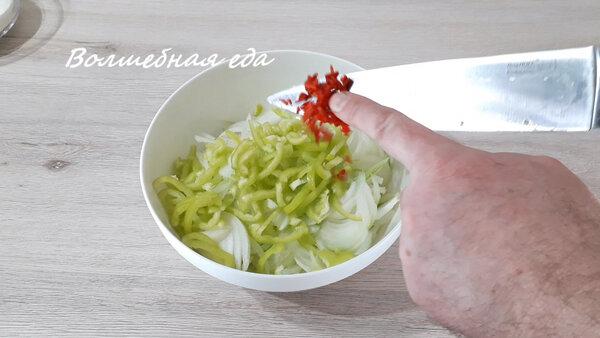 Болгарский перец нарезаю тонкой соломкой, а острый перец очень мелко. Добавляю их к луку.