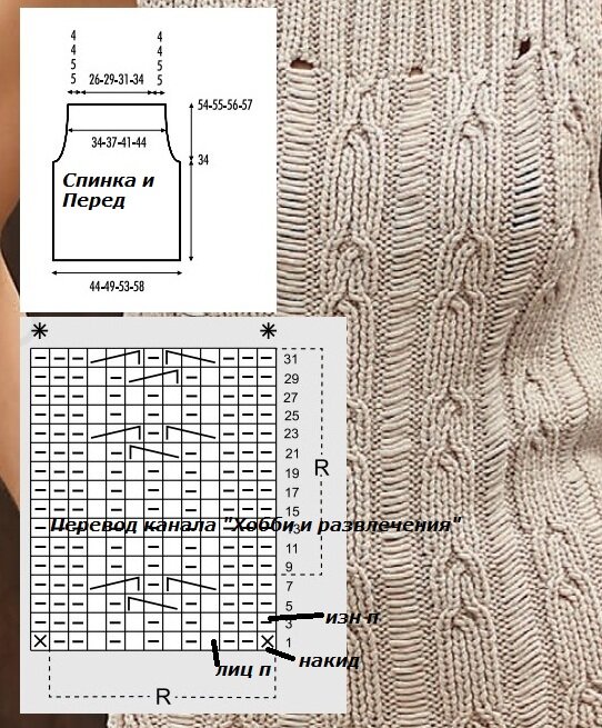 Описание дано на размер 38-40, 42-44, 46-48, 50-52. Пряжа: 5, 6, 7, 7 м. Спицы для вязания № 5,5 мм. Плотность вязания 17 п х 24 ряда.