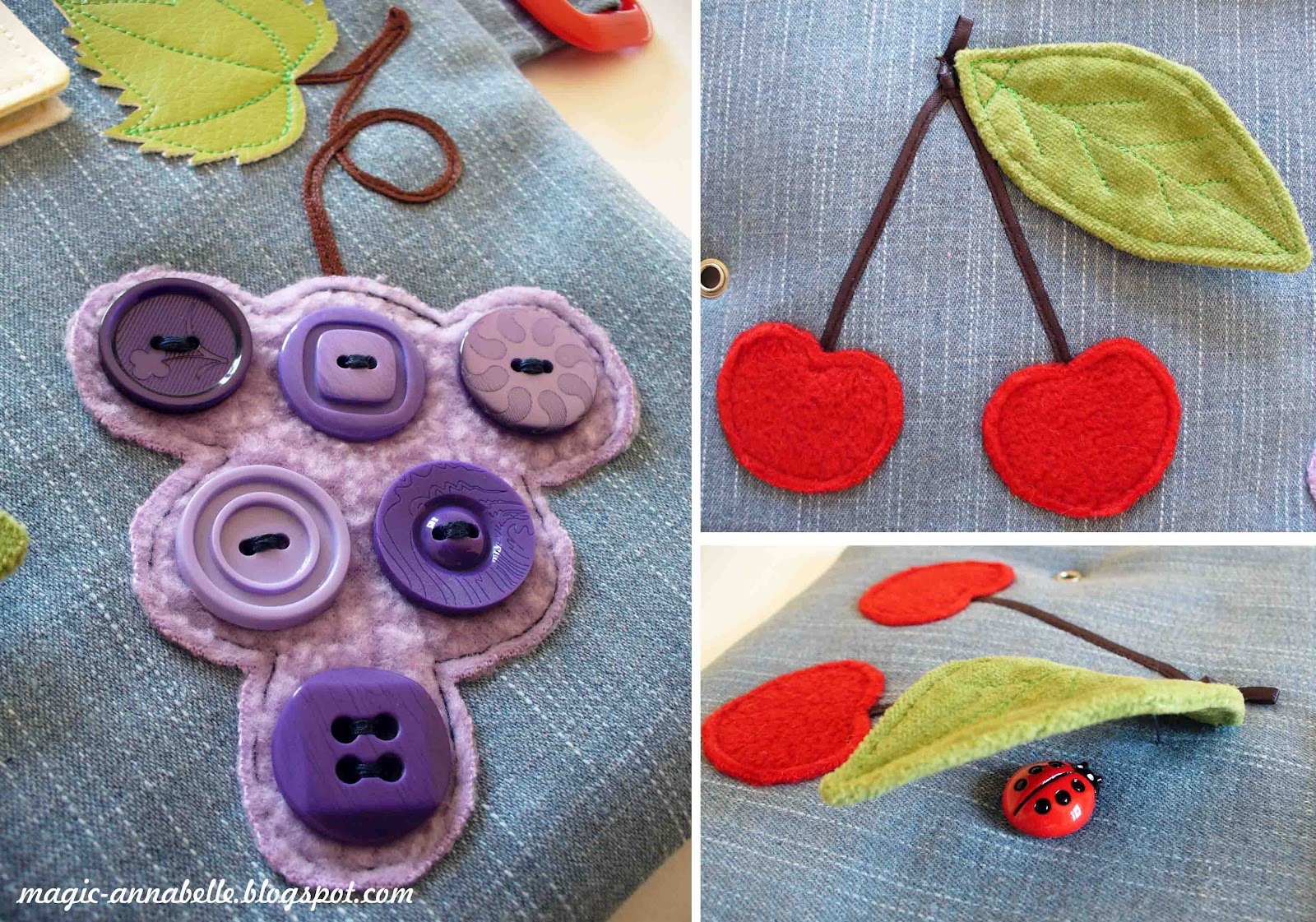 Странички подробнее: Домик. Чтобы дверь открылась, нужно позвонить в колокольчик, дверь на липкой ленте велкро, за дверью прячется мишка, за шторкой на окошке стоит в горшочке цветочек, серединка - бусинка. На дереве растут вишенки (3 пуговки - 6 вишенок, а на соседней страничке растут яблочки 5 штук. Можно считать, сравнивать, где больше-меньше). Забор - шнуровка (нужно починить забор). Можно шнуровать по-разному: прямо, крест-на крест или пропускать шнур не по своей линии, а в нижнюю верхний шнур, в верхнюю - нижний. Внизу цветочки, связанные из х/б ниток, полностью снимаются, тренируем застежку - пуговку. Можно одевать цветочки по цвету пуговок.