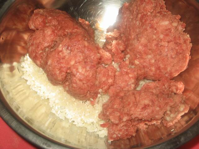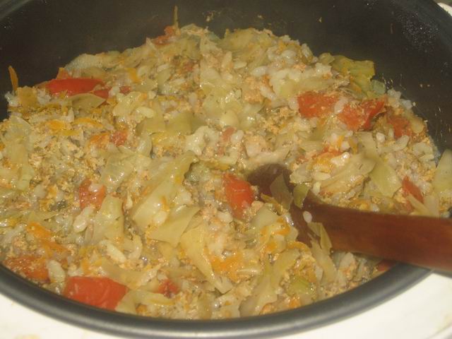 Добавить фарш с рисом и морковь.