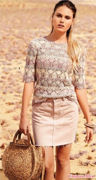 Три пастельных оттенка, красивый ажурный узор и мягкий биохлопок - облегающий джемпер с короткими рукавами гораздо интереснее футболки, хотя может быть столь же непринуждённым в компании с джинсовой юбкой.