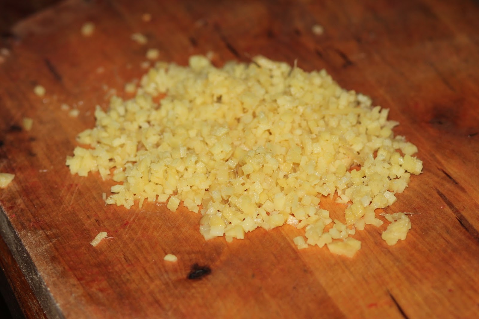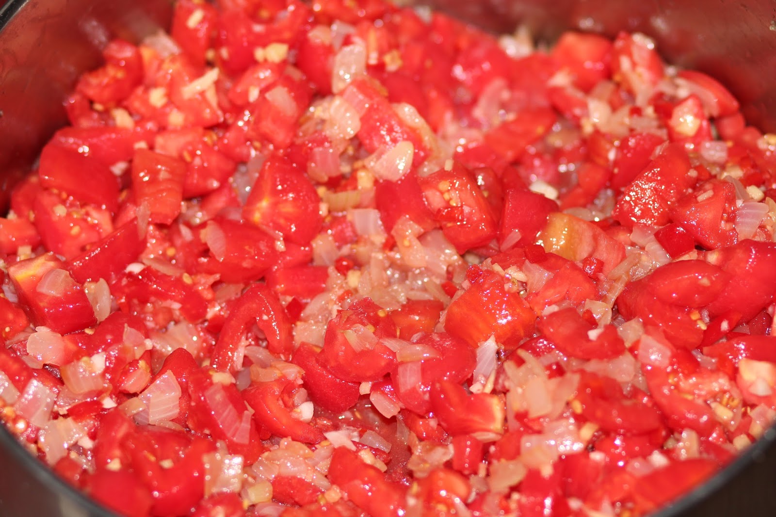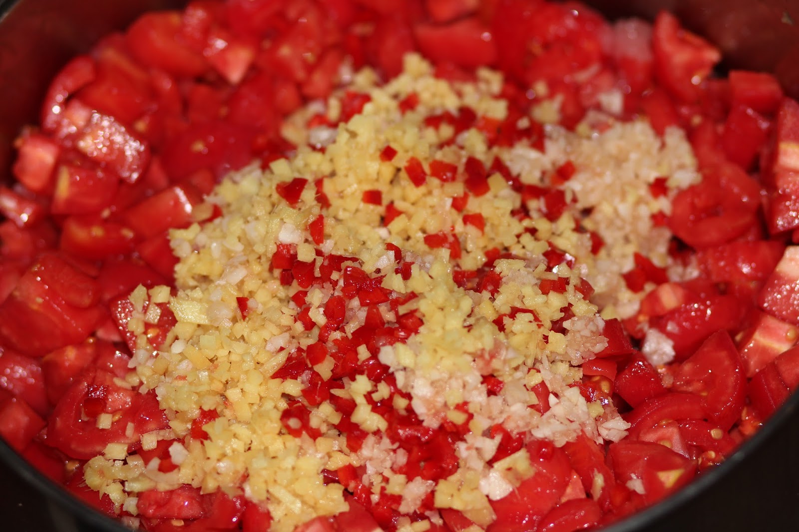 11. Смешать в кастрюльке помидоры, острый перец, чеснок, имбирь и обжаренный лук.
