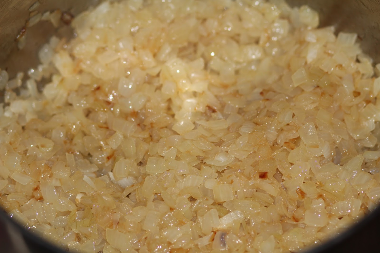 2. Обжарить лук на оливковом масле до слегка золотистого цвета.