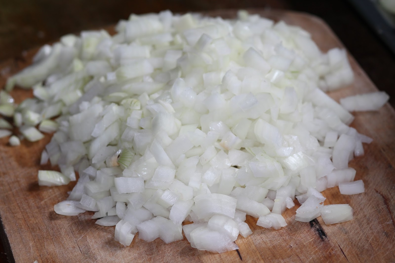 1. Репчатый лук нарезать кубиком, примерно 0,7 х 0,7 см.
