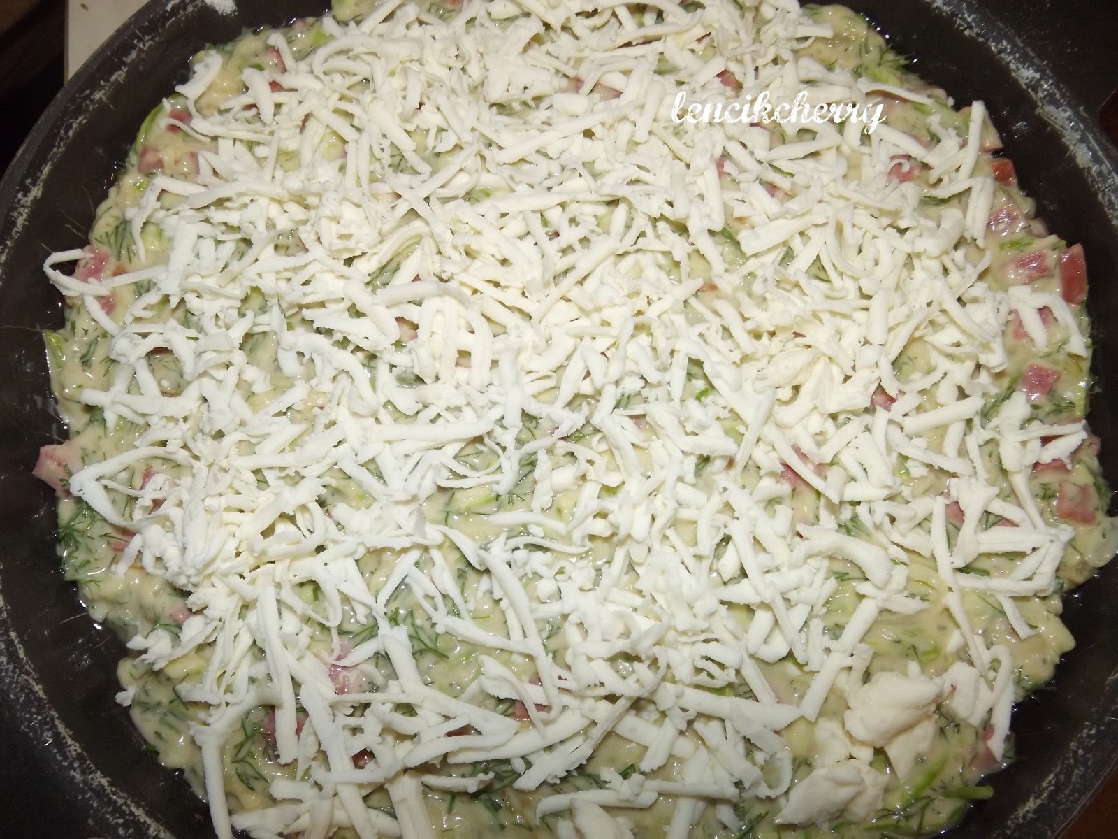 Натереть на крупной (или мелкой, кому как нравится) терке кабачок. Посолить его и оставить в дуршлаге для того чтобы с него стек сок, примерно 5-10 минут. Нарезать мелко репчатый лук, обжарить его в сковороде на растительном масле до золотистого цвета. Отжать кабачки еще раз и переложить их в миску. Добавить к ним яйца, сахар и обжаренный лук с маслом в котором он жарился, все перемешать. Затем постепенно добавить муку и разрыхлитель, все перемешать. Нарезать мелко кубиками колбасу, порубить мелко укроп и чеснок (или пропустить его через чеснокодавку), и все это тоже добавить в тесто, все хорошо перемешать.