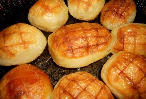 Блюдо имеет сладковатый привкус, напоминает картофельное пюре в хрустящей корочке. Кроме того, клубни остаются крахмалистыми, не высыхают и не разваливаются.