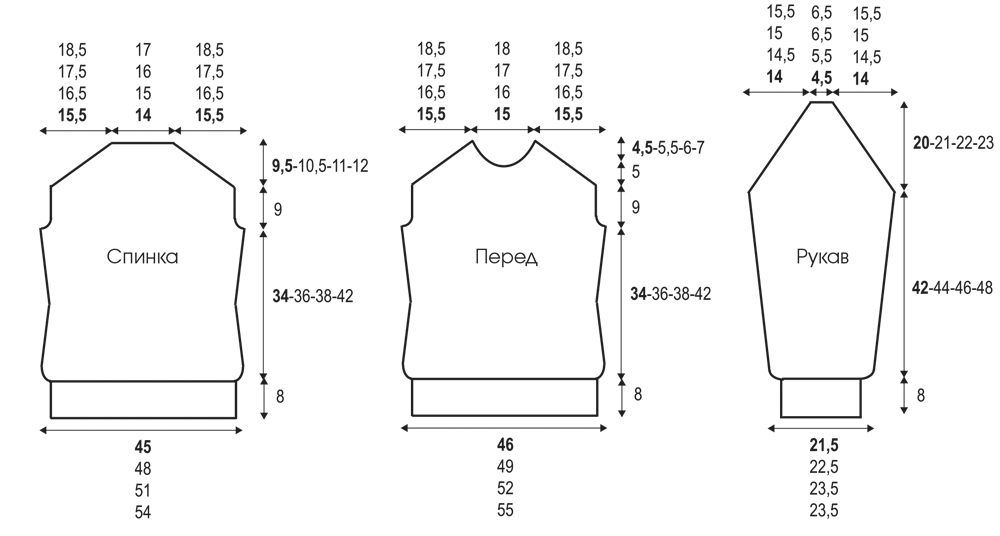 Для завершения реглана через 9 см от начала пройм с обеих сторон после 2 первых и перед 2 последними петлями в каждом ряду убавить 26 (28/30) 32 х 1 п.