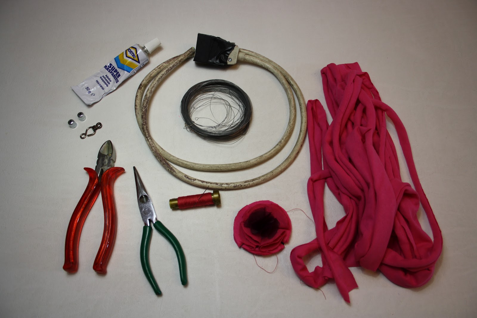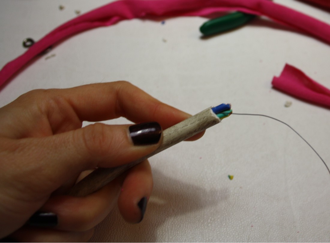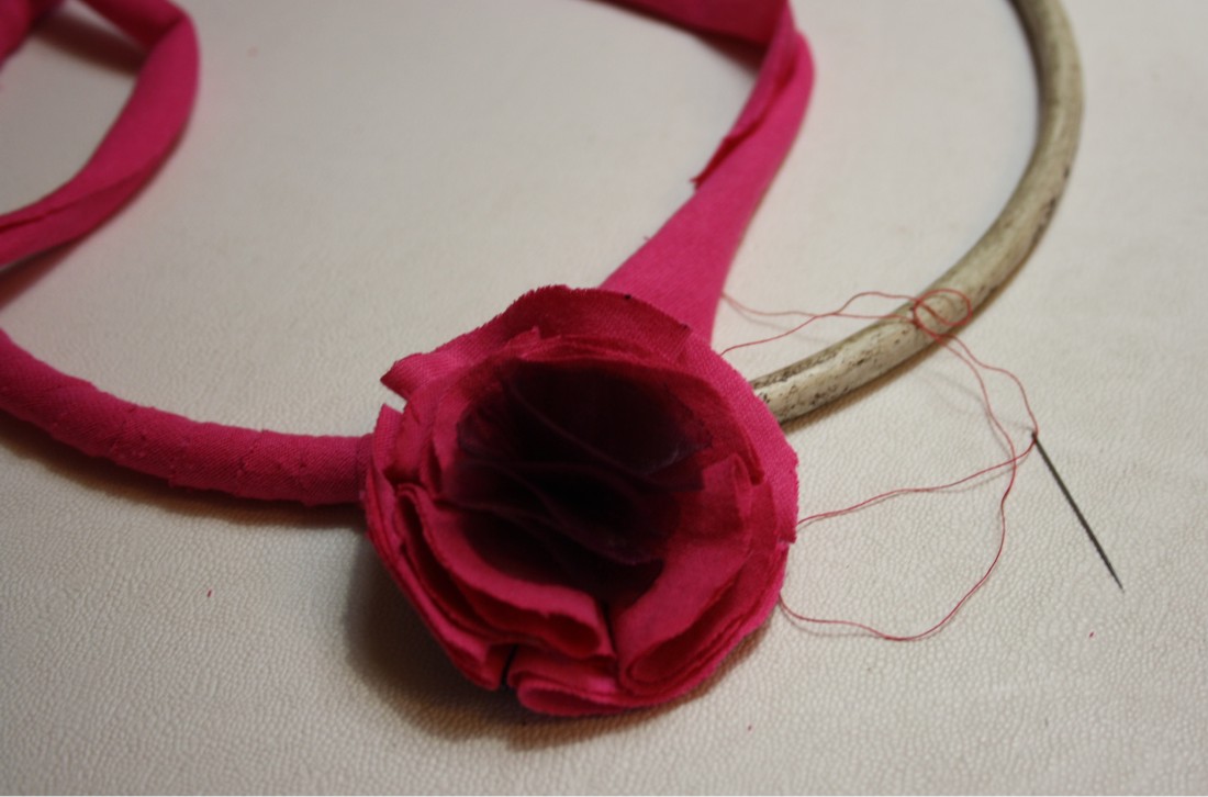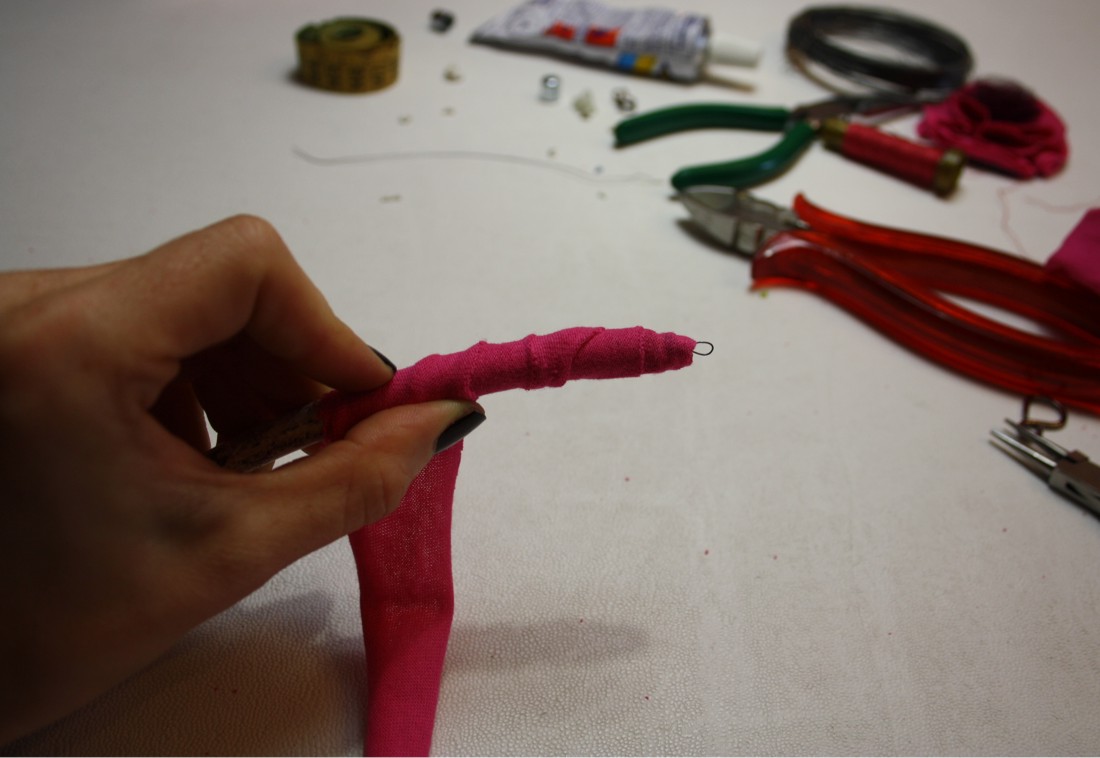 Mettere un po' di colla all'inizio del cavo elettrico e iniziare a ricoprirlo con la stoffa, continuando fino al punto in cui vogliamo inserire il fiore, quindi cucire semplicemente con ago&filo il fiore precedentemente preparato (qui il tutorial per realizzarlo).