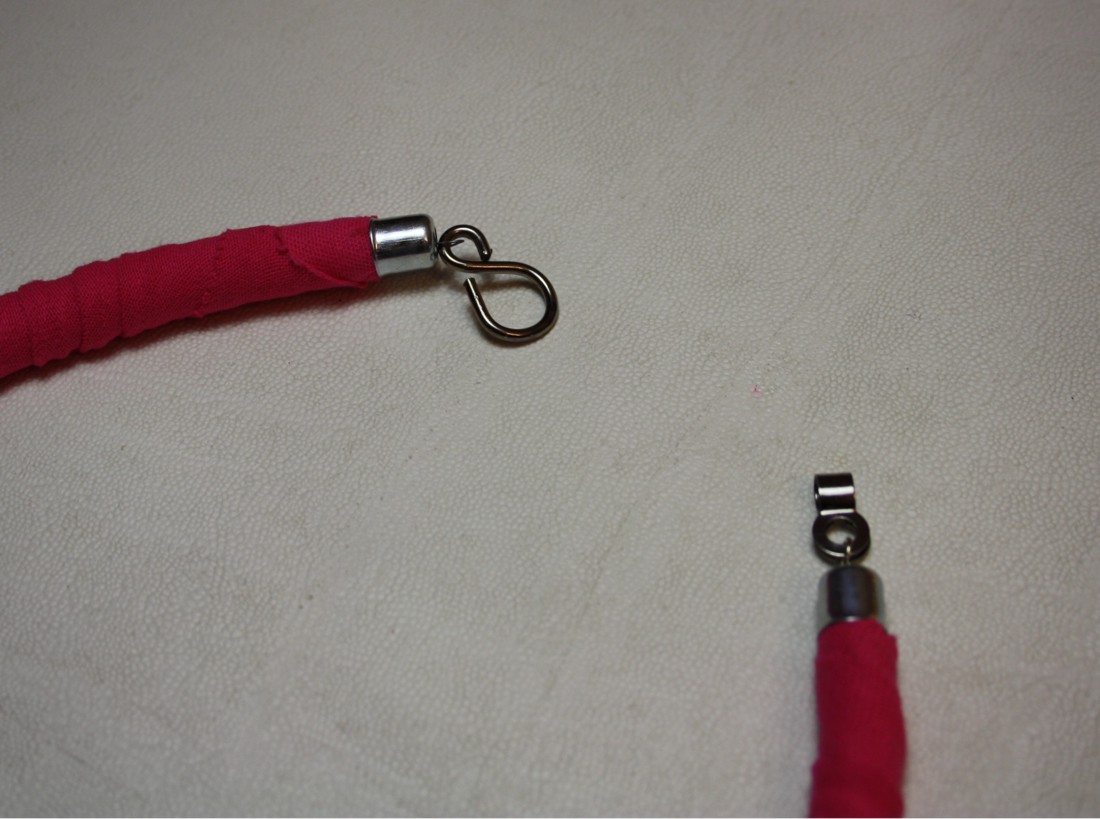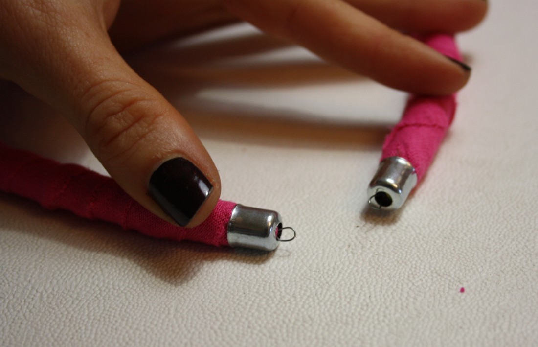 Una volta ricoperto tutto il cavo elettrico, fissare l'ultimo lembo di stoffa con un po' di colla, e anche da questa parte creare una piccola asola con il filo metallico.