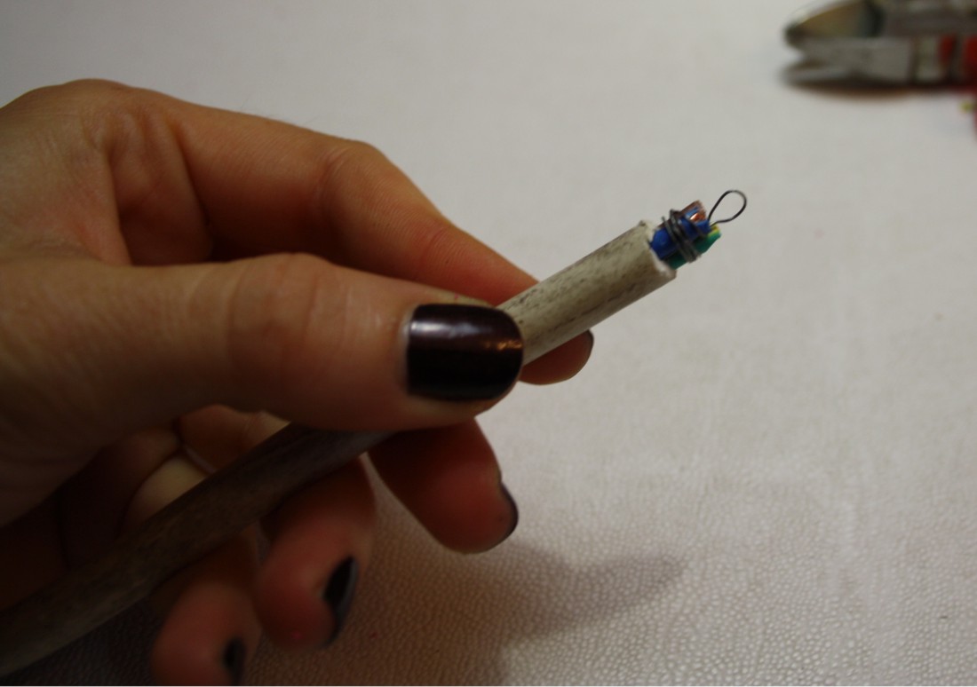 Creare una piccola asola e fissare bene il filo metallico (facendolo girare più volte attorno al cavo).