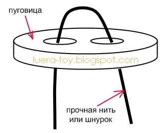 Взять две пуговицы, примерно одинакового размера. Продеть через одну пуговицу прочную нить (я взяла хлопковую в несколько сложений).