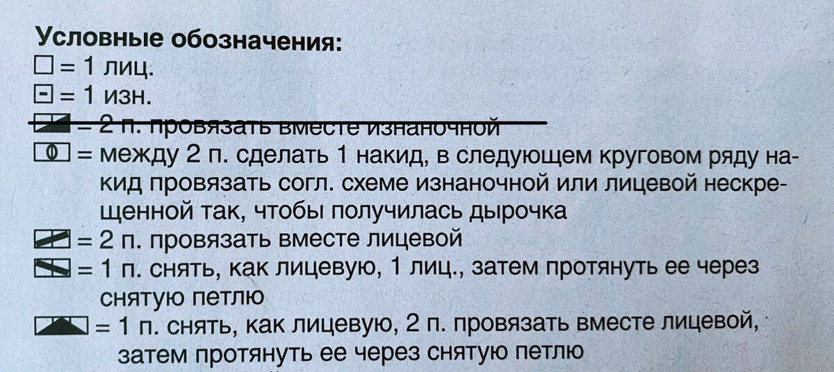 23 ряд: 1 лиц, накид, 1 лиц, 2 вместе лиц с наклоном влево, 7 лиц, 2 вместе лиц с наклоном вправо,1 лиц, накид, 1 лиц, накид, 1 лиц, 2 вместе лиц с наклоном влево, 7 лиц, 2 вместе лиц с наклоном вправо,1 лиц, накид