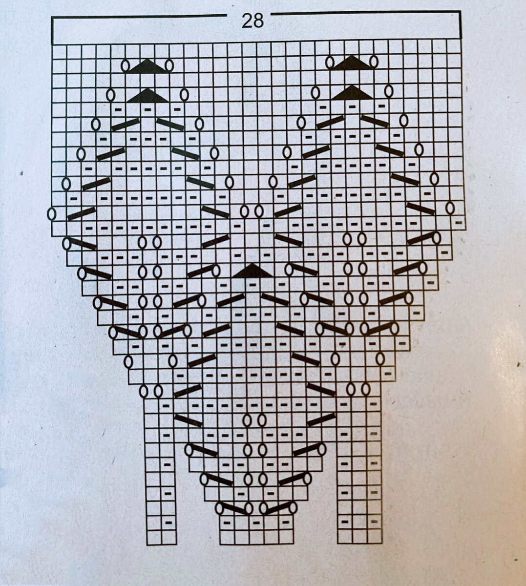 Узор начинается с 10 петель и к концу расширяется до 28 петель. В описании только лицевые ряды, так как вяжется кокетка по кругу.