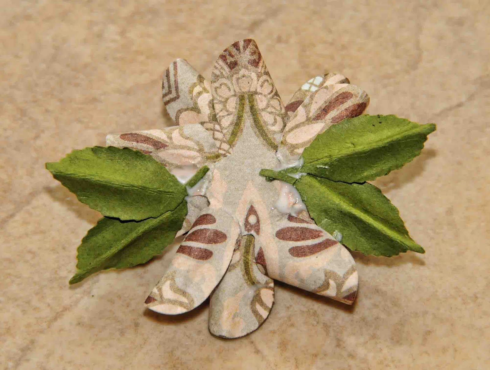 Glue the leaf clusters to the underside of the flower in any way you like. I did opposite ends in this tute. Make sure you like how much is showing on the right side of the flower.
