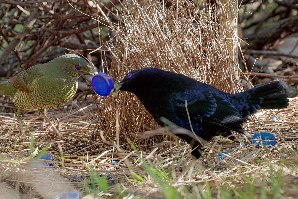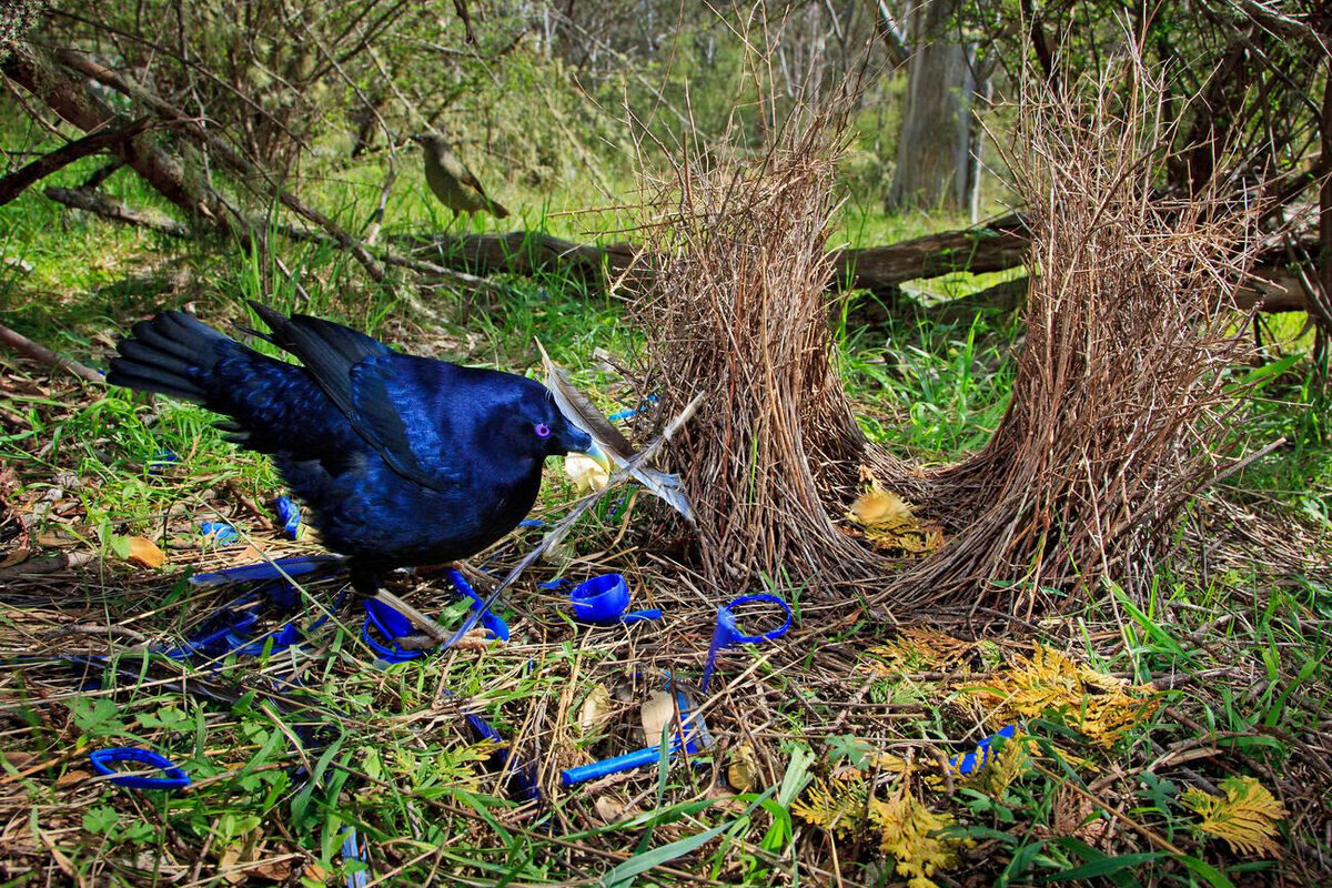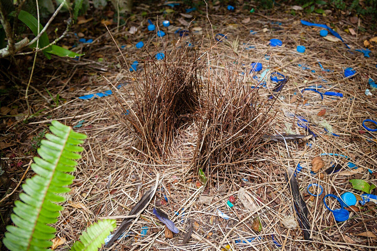 Интересно, что и внутри, и вокруг «дворца» шалашника можно найти совершенно неожиданные вещи: детские игрушки, крышки от бутылок, ракушки, зубные щётки, пряжки, камни.
