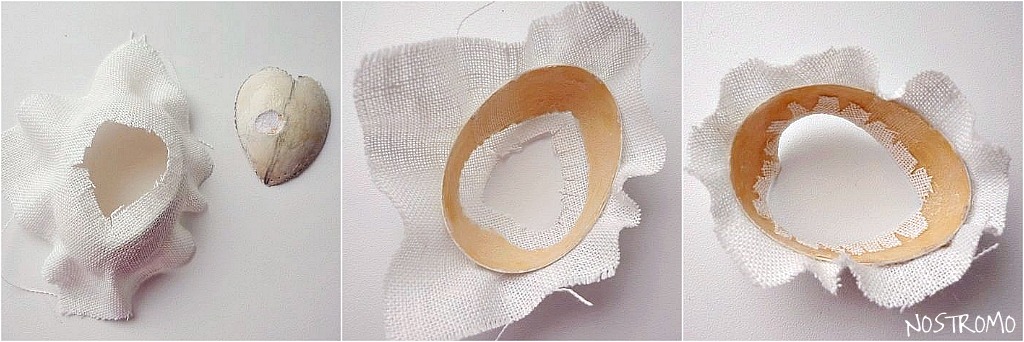 Сейчас нам придётся работать с хрупкой основой. Намазываем клей на центр скорлупы,(клей должен быть достаточно густым,тогда он не проступит на ткани,и позволит двигать и растягивать её без проблем) и приклеиваем ткань с вышивкой. Наносим клей на края половинок,равномерно распределяем ткань(делим на 4 равные части)и приклеиваем противоположные стороны, стараясь равномерно и осторожно натягивать ткань. Обрезаем лишнюю ткань,оставляем только небольшое количество для подгибки (примерно 1 см),рассекая её в форме "солнышка", подгибаем на внутреннюю сторону,расправляем и приклеиваем. На края половинок наносим клей и осторожно прижимаем их друг к другу. После склеивания место стыка декорируем шнуром или атласной ленточкой.
