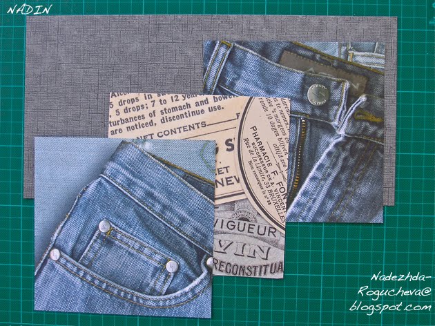 1.4. На обратную сторону из джинсовой бумаги с использованием двухстороннего скотча приклеиваем заплатки, т.к. открытка предусматривает некий кармашек на фронтальной части для размещения там денег в качестве подарка или другого секретика. Снова тонируем.