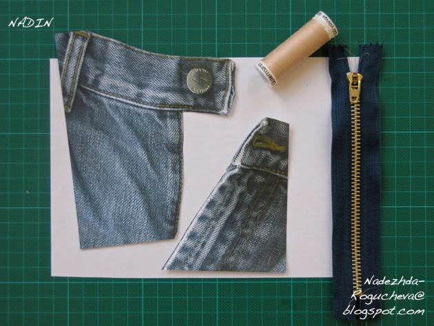 1.2. Из квадрата с изображением переда джинс вырезаем элементы фронтовой части. В месте ширинки пришиваем на швейной машинке заготовленную молнию (я использовала грубую металлическую молнию, ни в коем случае не потайную).