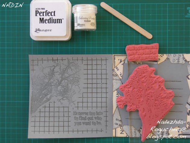 3.2. На противоположной стороне с помощью бесцветной пудры для эмбоссинга наносим штампы (в моем случае - дерево и надпись). На оставшейся поверхности я разместила натирку - сетку, которую в принципе можно и нарисовать.