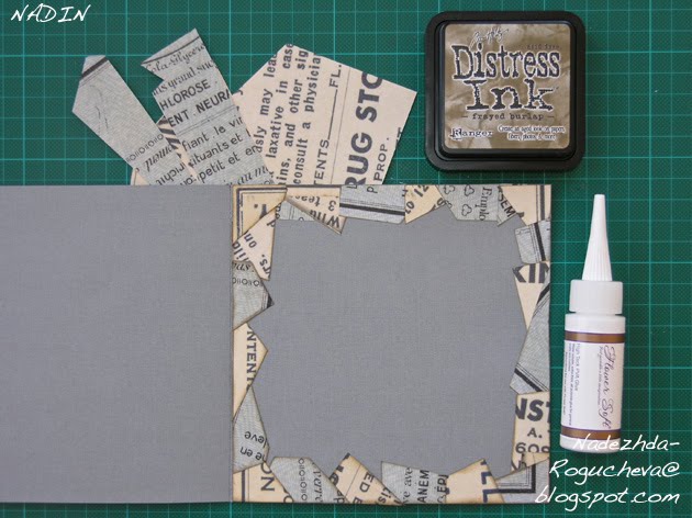 3.1. Из использованной для подложки бумаги, вырезаем маленькие кусочки, тонируем их и с помощью клея приклеиваем по периметру внутренней части открытки, где предполагается надпись.