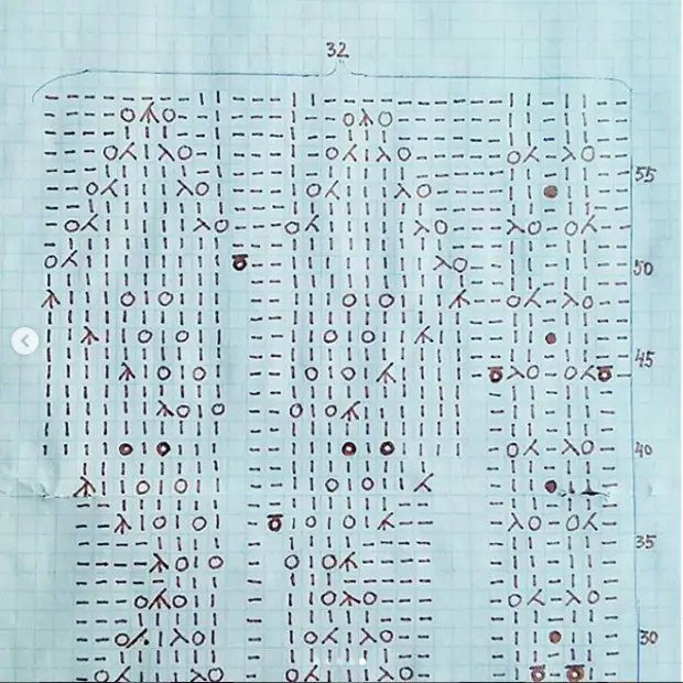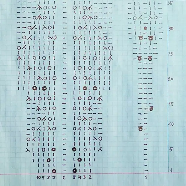 1-й ряд - 10 раз повторяем раппорт узора, вяжем по схеме 58 рядов, формирую кокетку. Когда кокетка связана на спицах должно быть 320 петель. Начало круга - это центр спинки.